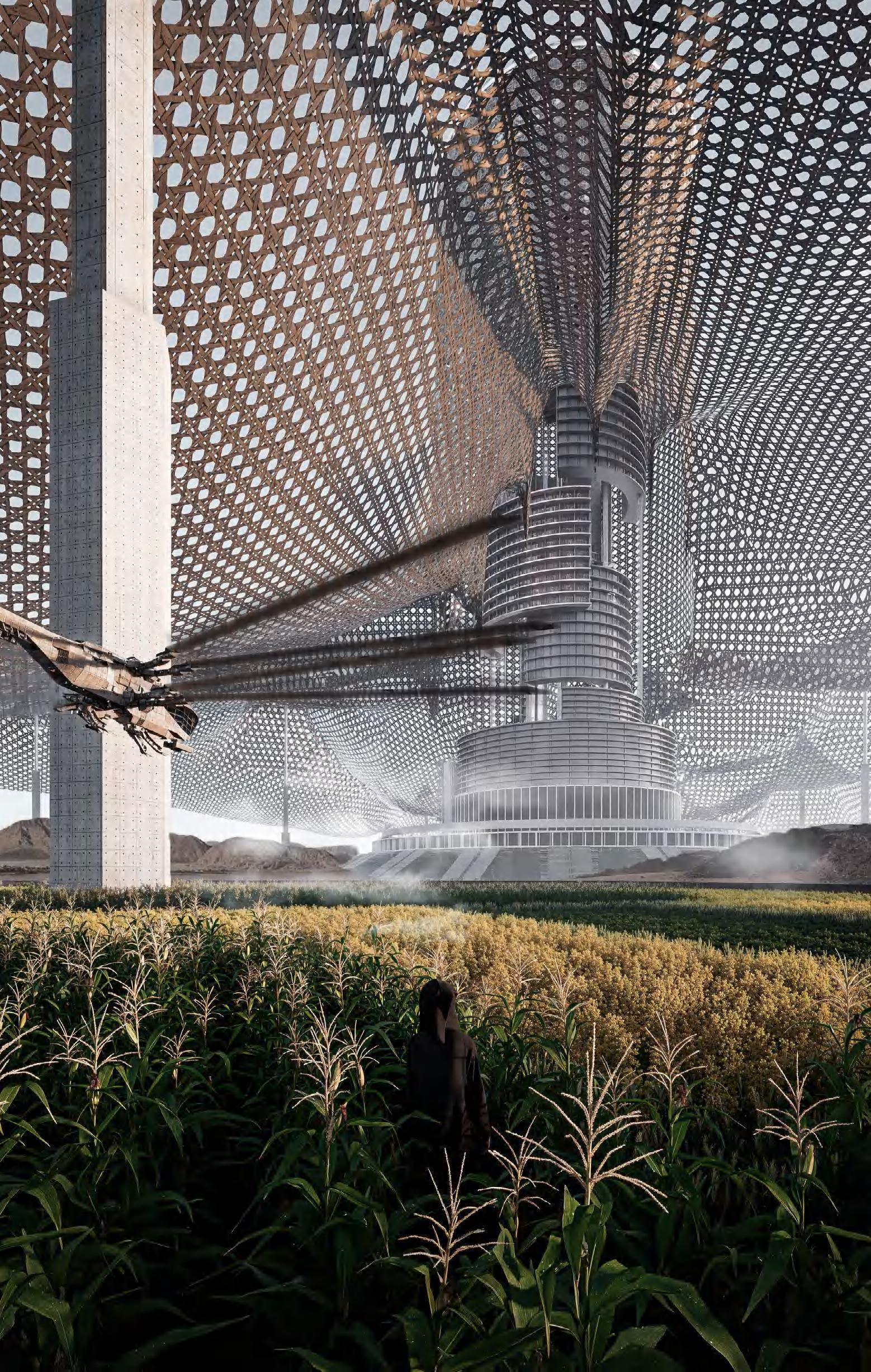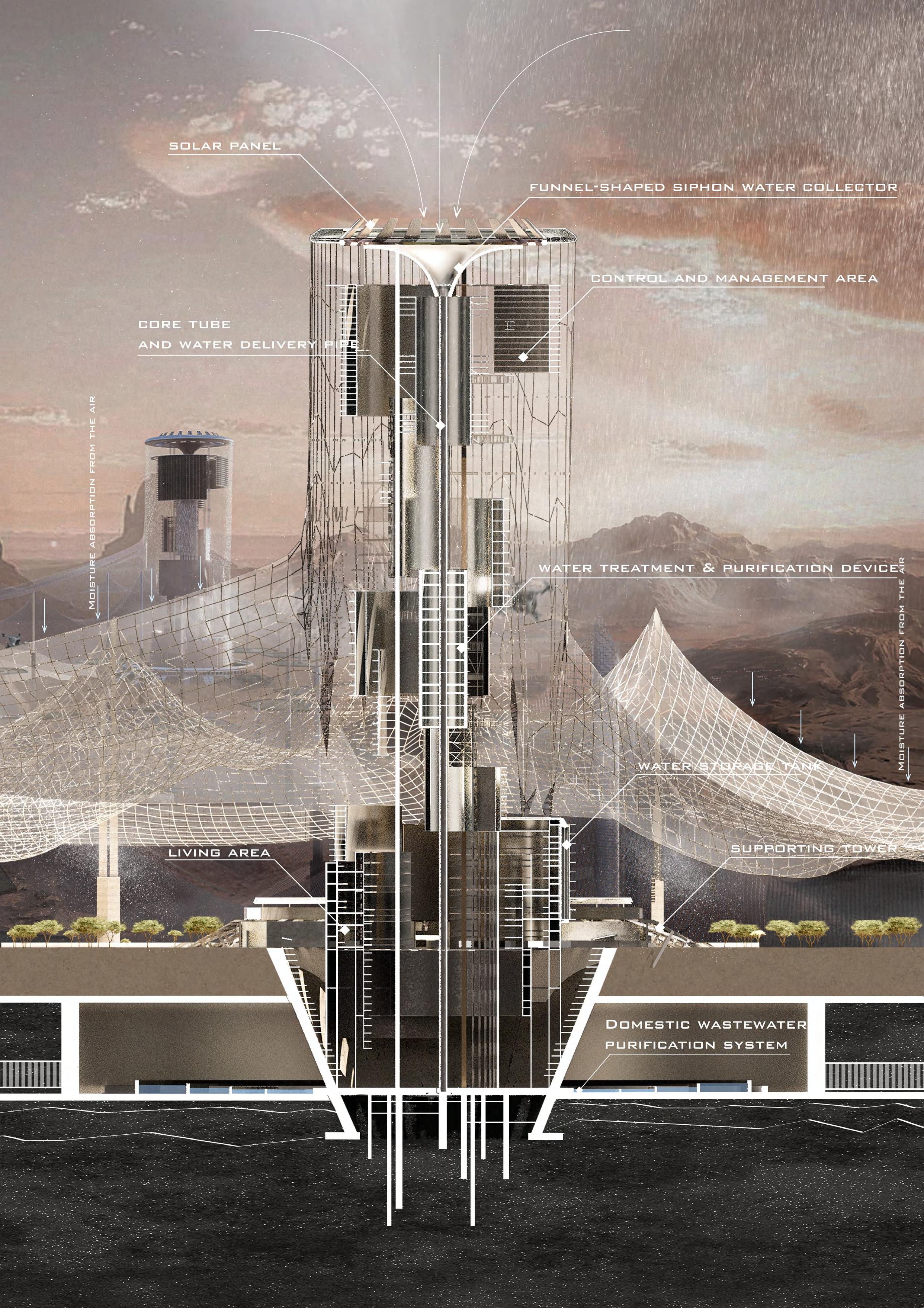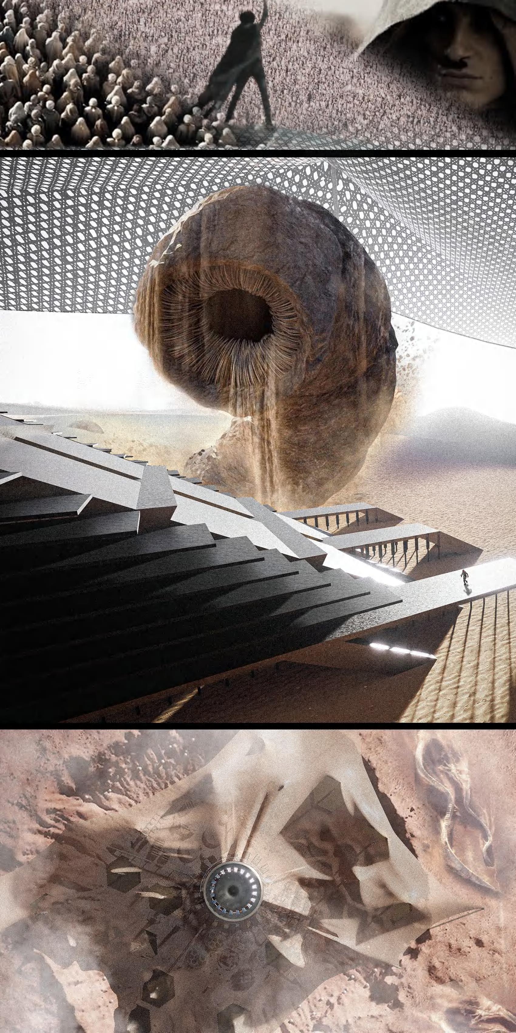 Inspired by the narrative imagery of the desert environment in DUNE, this project proposes a pioneering concept design for water collection and ecological symbiosis: the Water Collection Tower. The design aims to respond to the core themes of water scarcity and sharing in desert ecosystems through the translation of scenes and spaces, while exploring the possibility of sustainable life forms in extreme environments in the future. 4/4