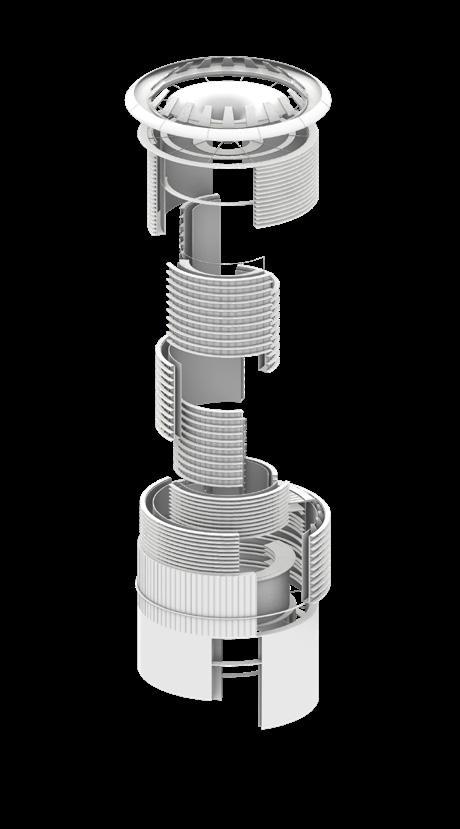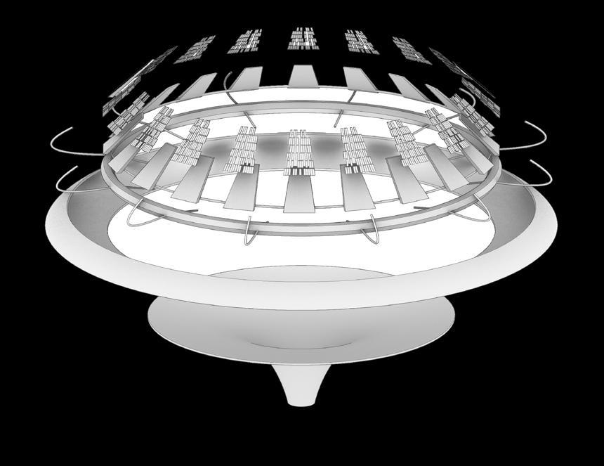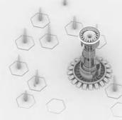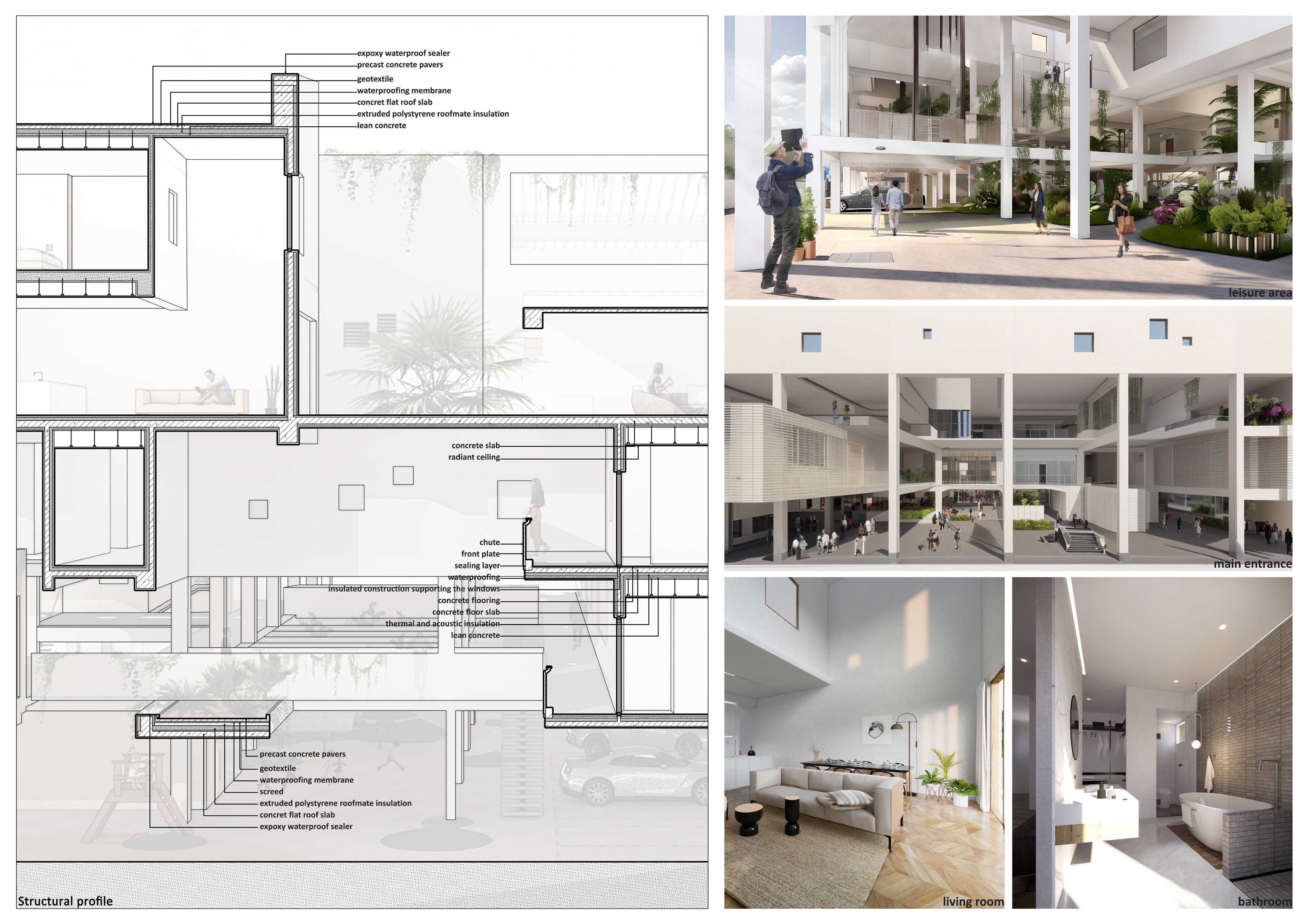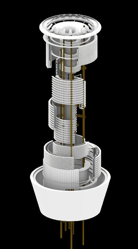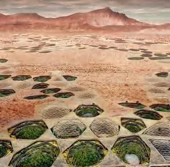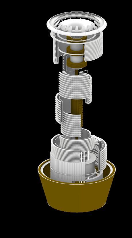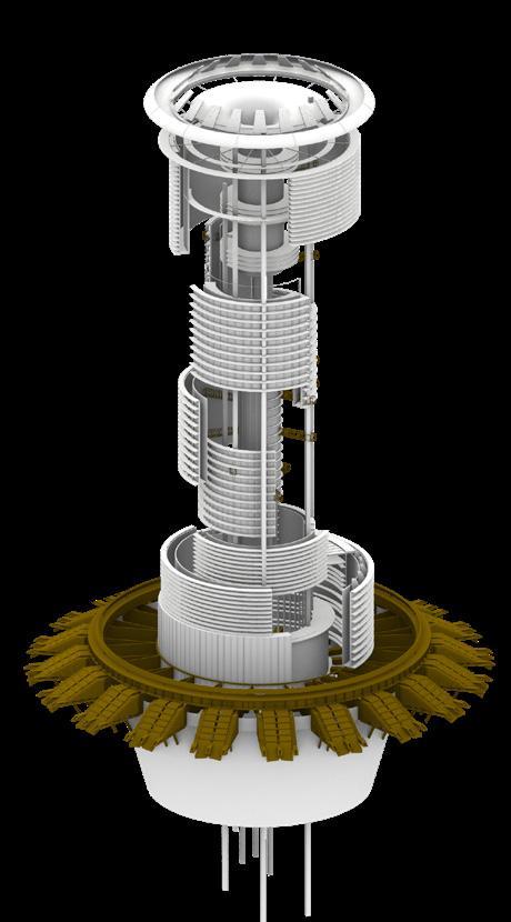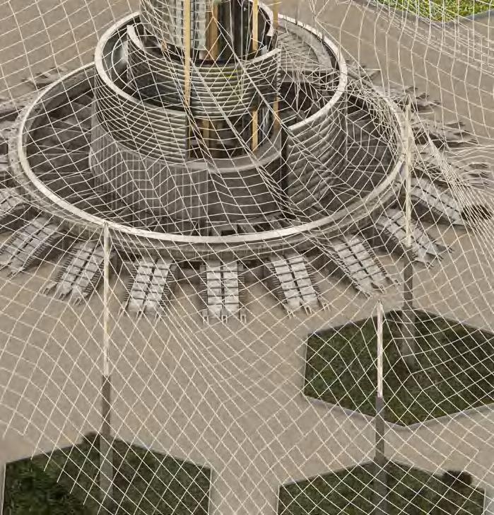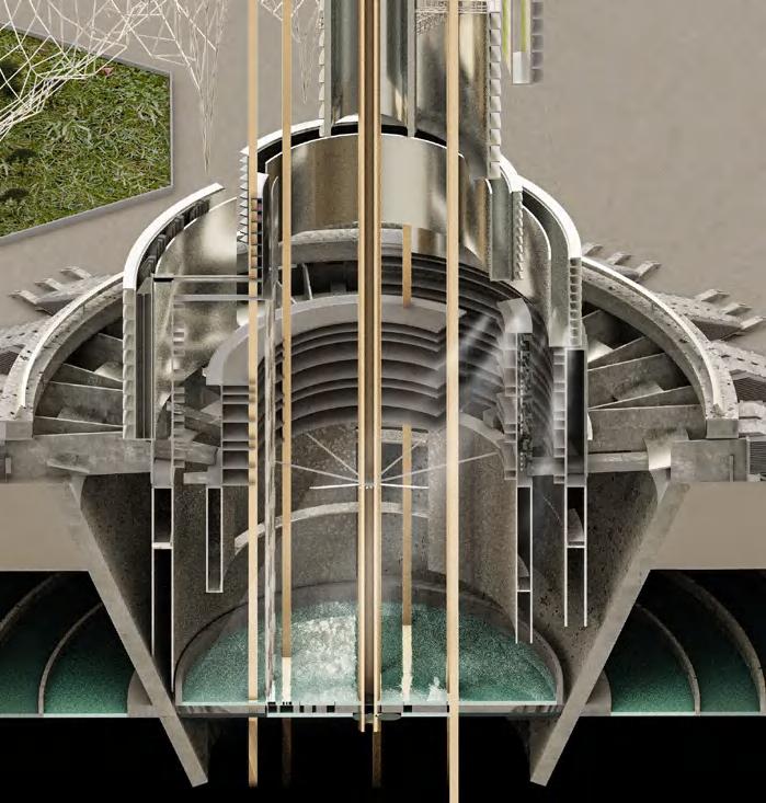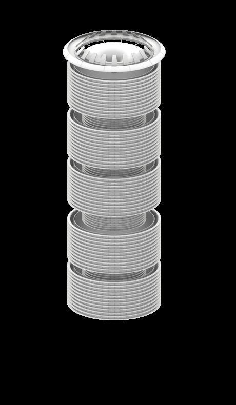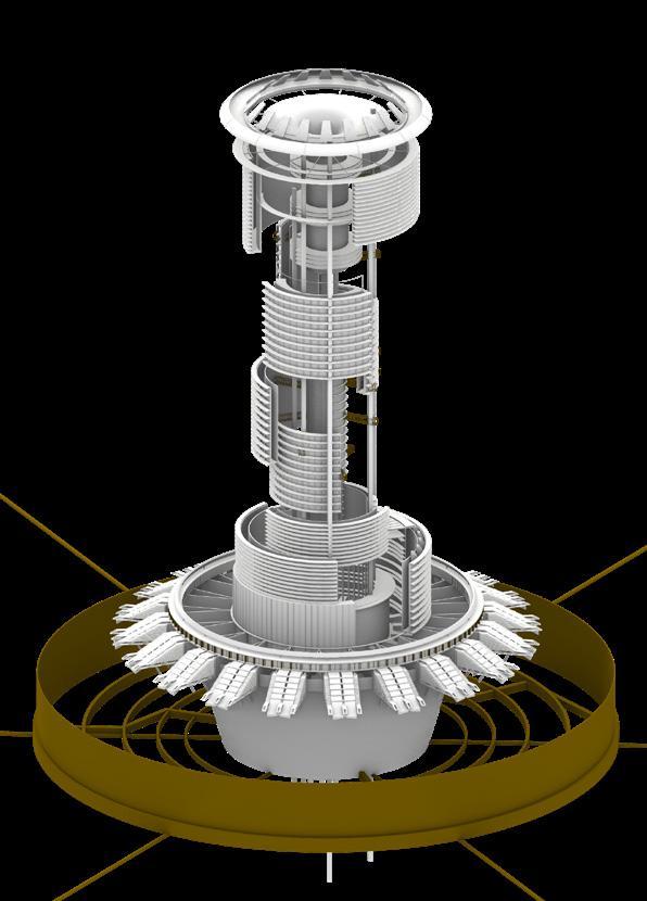 The bottom area embodies the humanized and ecological design of the tower, combining living with environmental protection to create a sustainable ecological community: LIVING AREA: Compact modular houses are designed to provide residents with a comfortable and safe living environment using water processed within the tower and the ecosystem outside the tower.