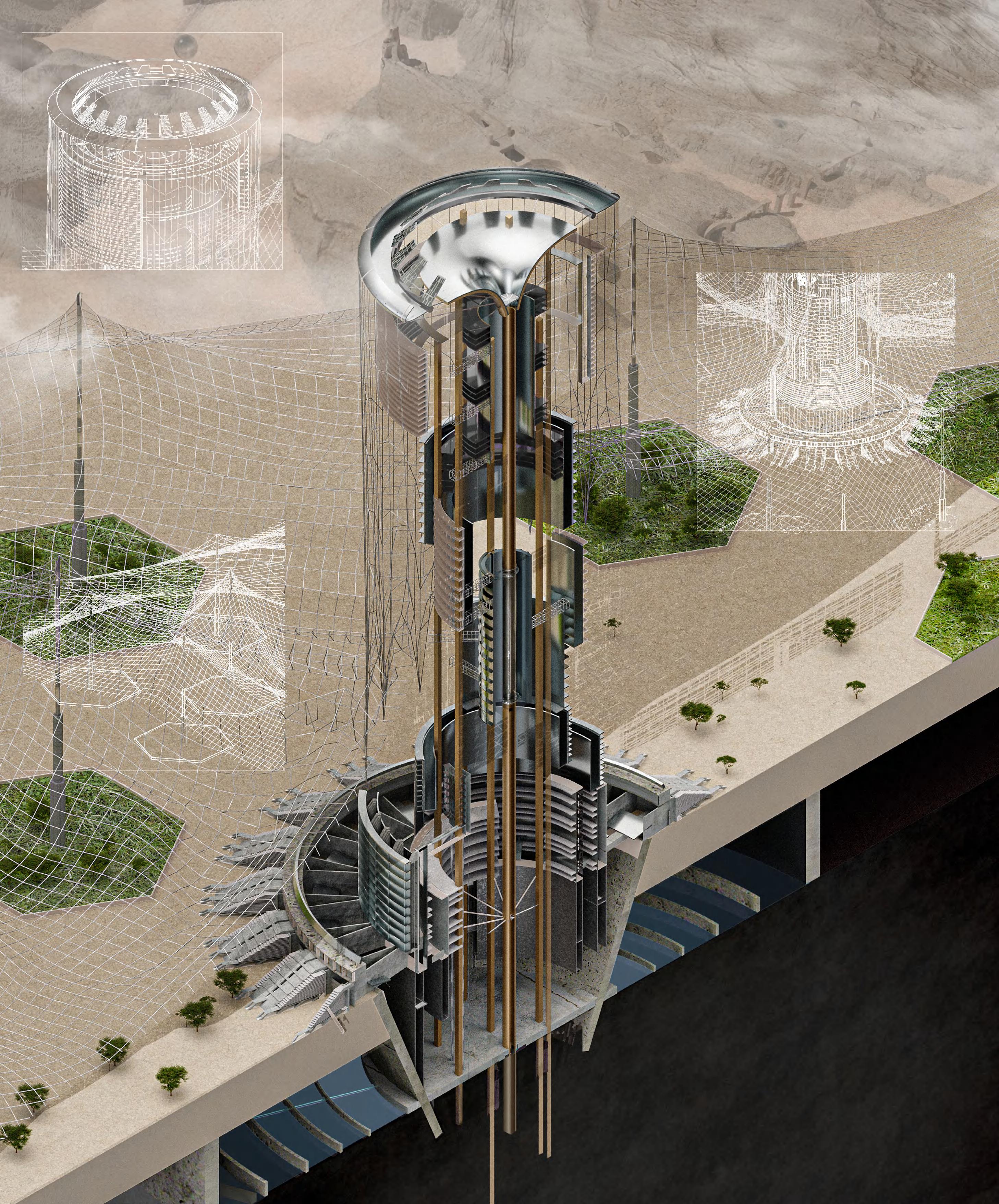 The “Tower of Life in the Desert” is not just a physical space, but a response to the philosophical question of life’s existence. Heidegger’s Dasein suggests meaning comes from awareness of one’s existence and surroundings. The tower thus serves not only as a water collection structure but also as a symbol of the relationship