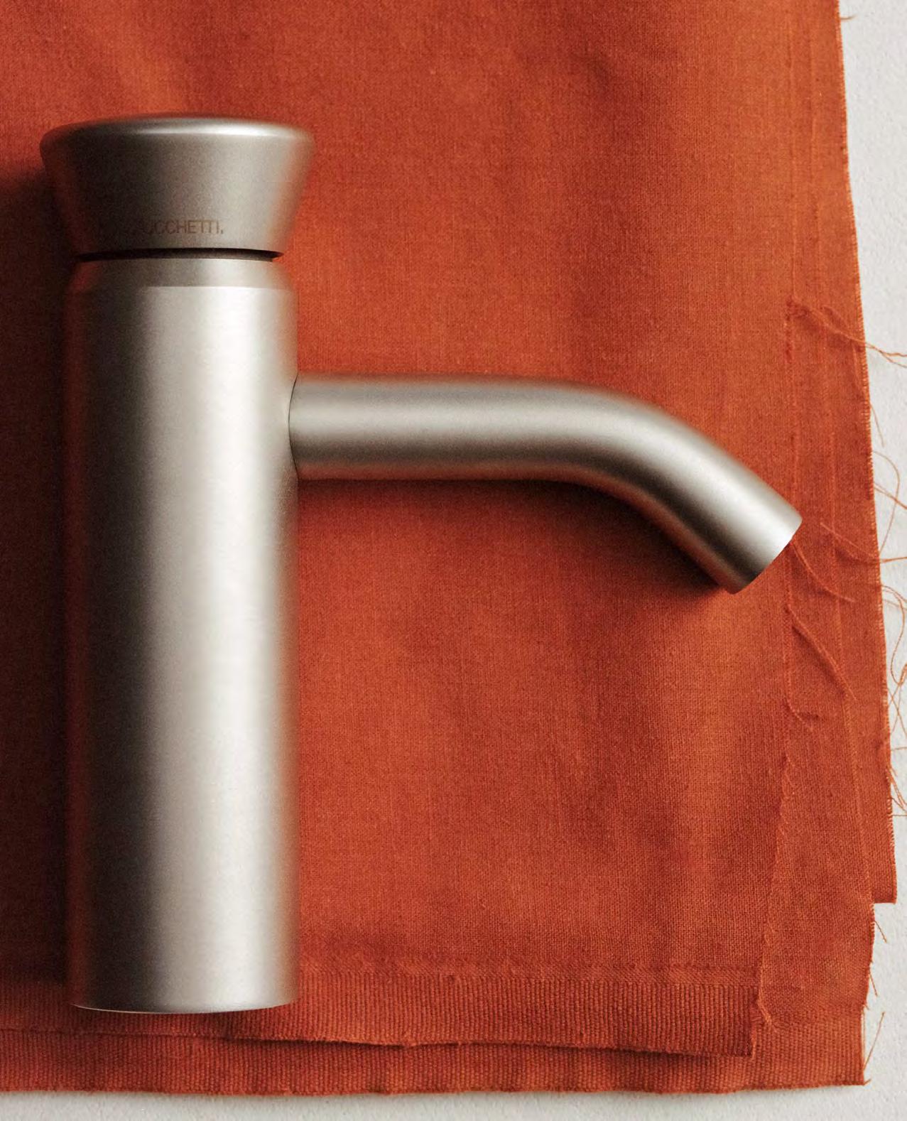 «Pan es nuestra interpretación del tipo esencial, cilíndrico del monomando. Nos hemos concentrado en el empalme entre los elementos verticales y horizontales: del mismo modo que en la naturaleza no existen cortes ni soldaduras, del cuerpo de nuestro grifo, pensado como el tronco de un árbol, surgen la boca de suministro y el mando con un delicado empalme, diseñado con la misma lógica ininterrumpida entre el tronco y la rama». Así contaban Ludovica Sera昀椀ni y Roberto Palomba en 2004 el origen de Pan, un proyecto que obtuvo un éxito inmediato convirtiéndose en un superventas de Zucchetti.