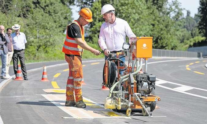 Dass er nicht nur planen sondern auch Hand anlegen kann bewies Regierungsrat Weber den anwesenden Vertretern aus Politik Wirtschaft und Medien, indem er mit einer Bodenmarkierungsmaschine symbolisch ein Stück gelben Radstreifens aufmalte Anschliessend liess er sich mit Kantonsratspräsident Karl Nussbaumer in einem Oldtimer vom Schmittli zum neuen Kreisel Nidfuren und zurück chauffieren Neuerdings