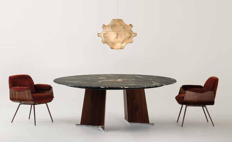 Libra je stůl s výrazně modernistickým tvarem. Kulatá verze má vrchní desku se zaobleným okrajem, nohy jsou vyrobeny z kovových nebo dřevěných desek ohnutých do tvaru „V“ a jsou spárovány s estetikou židlí Libra. Design GIAMPIERO TAGLIAFERRI