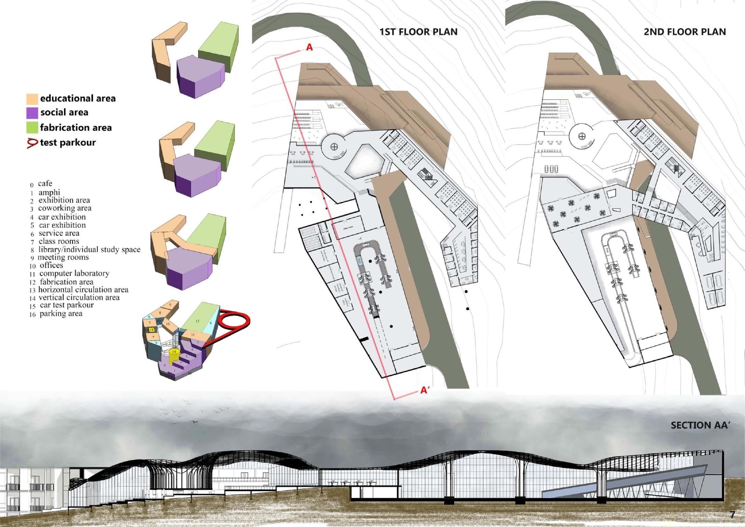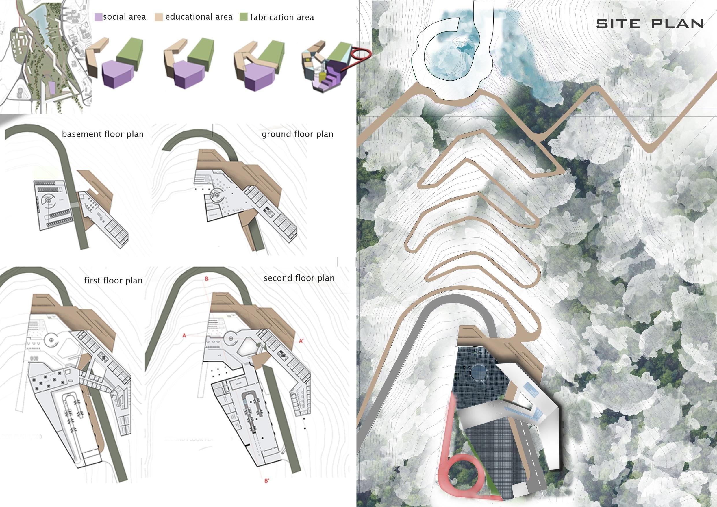This auditorium aims to solve the problem not only with its function but also with its abstract shape. Instead of putting a “real” frombuildingontheplaceofroundaboutI decided to make the roundabout act as an abstract artpiece exhibition platform. The inclined concrete box shape of the main hall and curvilinear shape of the secondary halls and serving functions cometogethertomakethebuildingactas an artpiece. Also the inclination of the structures give us the clue about the undergroundlife-metro.