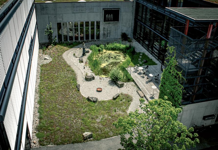 Zünd headquarters offer space to breathe freely, with green walls and roofs, and a courtyard featuring a natural habitat with pond.