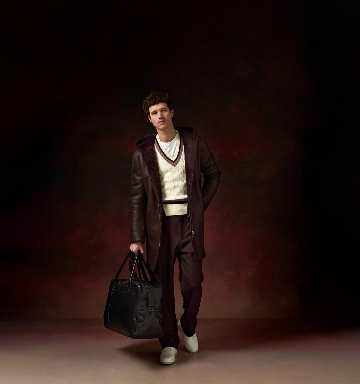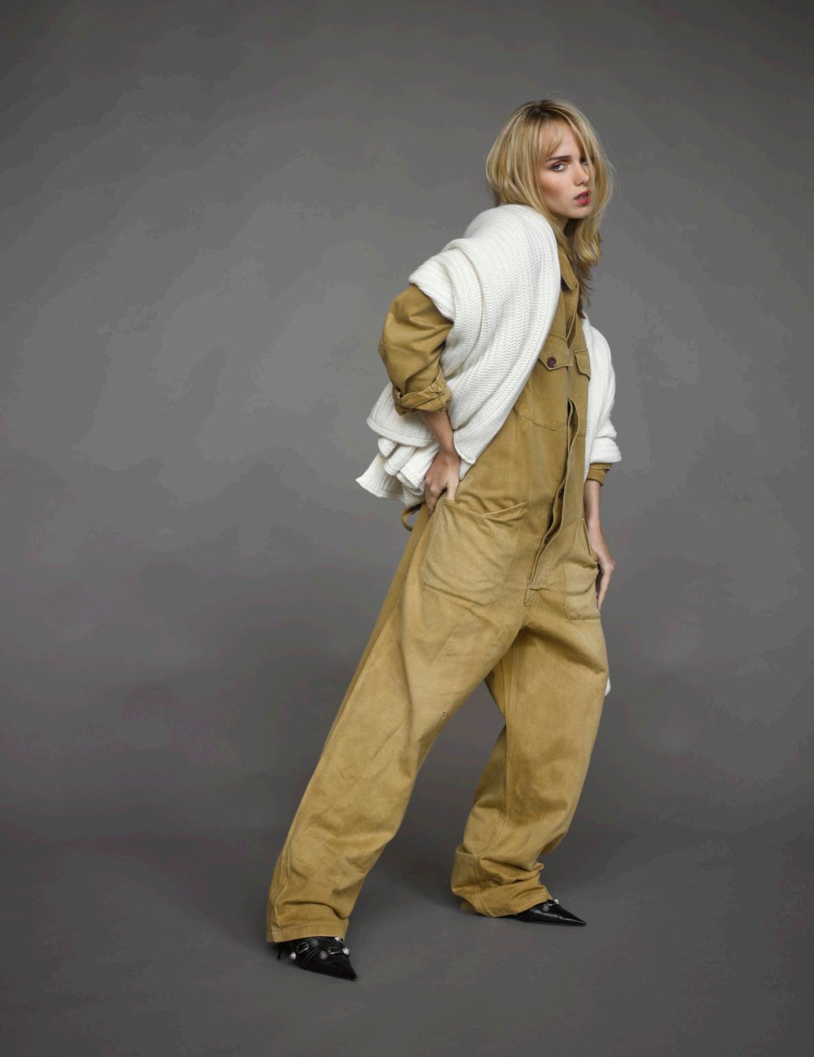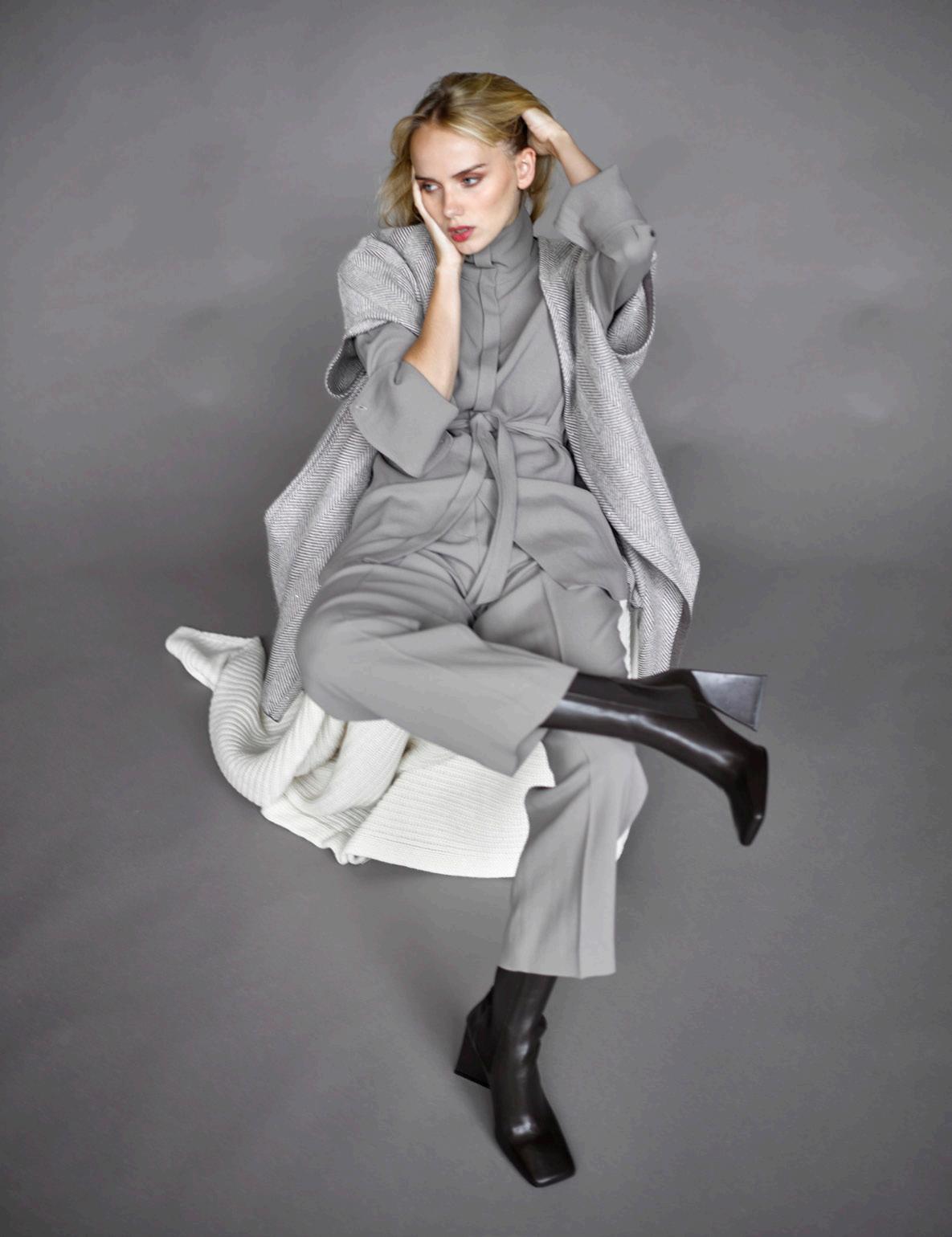 Manteau Tagliatore, chemisier et jupe Liviana Conti, le tout chez Revenge Hom. Bottines Balenciaga chez Ultima.
