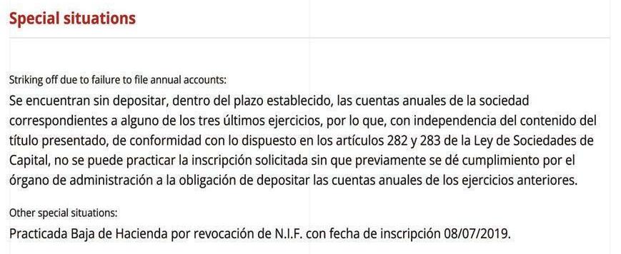 Mai mult, societatea nu are dreptul de a activa nici pentru că nu și-a depus situațiile financiare anuale, ultimele documente de acest gen disponibile în registrele publice spaniole fiind cele referitoare la anul 2010. Da, ați citit bine: 2010. Interesant ar fi de văzut cum și-au dovedit spaniolii istoricul financiar în fața ASVJ SA, dacă la autoritățile spaniole NU au fost înregistrate situații anuale.