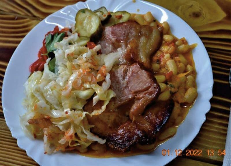 vreau, dar am lăsat-o pe ospătărița Liliana să-mi aprovizioneze farfuria cu niște iahnie, garnisită cu ciolan și murături. Am făcut o alegere bună mergând pe mâna ei. Bine că mi-a dat prin gând să fac o poză înainte să mapuc de lucru. De abia am dovedit tot ce era în farfurie. Am fost îndemnat sămi mai pun, dacă vreau, dar chiar că nu mai puteam să conduc înc-o iahnie cu ciolan. Am mulțumit frumos de masă și am plătit cei douăzeci și cinci de lei cuveniți. Unde aș fi putut să mănânc atâta cu banii ăștia?