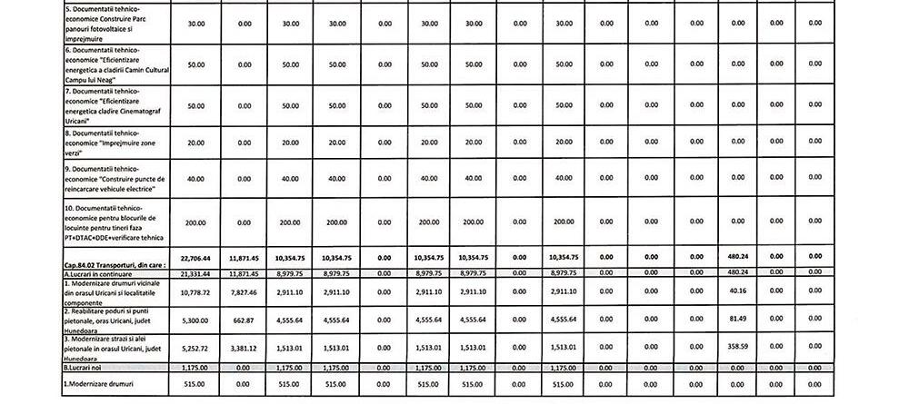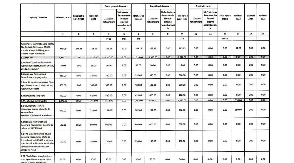 1.Anexa nr 1 - Bugetul general al Orasului Uricani pe anul 2022 in suma de 63.019,74 rnii lei la venituri si 66.087,49 mii lei la cheltuieli; 2.Anexa nr. 2 - Bugetul local al Orasului Uricani pe anul 2022 se stabileste la venituri in suma de 63.019,74 mii lei iar la cheltuieli in suma de 66.087,49 mii lei, cu un deficit de 3.067,75 mii lei si este defalcat in sectiunile: functionare la venituri in suma de 14, 150,83 mii lei si la cheltuieli in suma de 14.150,83 mii lei si dezvoltare la venituri in suma de 48.868,91 mii lei si la cheltuieli in suma de 51.936,66 mii lei.