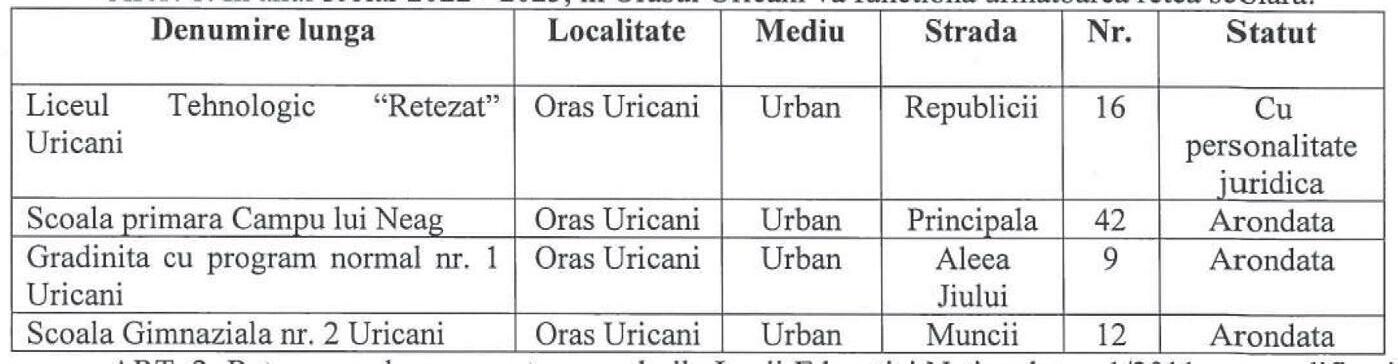 ART. 1. In anul scolar 2022 - 2023, in Orasul Uricani va functiona urmatoarea retea scolara:
