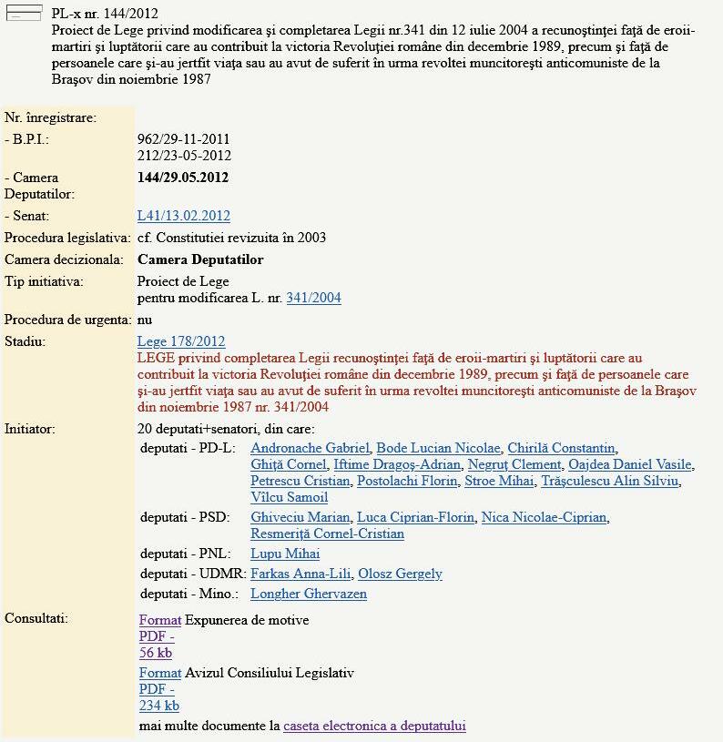 (absolut similar cu proiectul de lege pe care vi-l propun să-l depuneți în Parlamentul României în favoarea și pentru drepturile minerilor revoltați ai Văii Jiului în august 1977) prin care a fost prorogată/ extinsă perioada de depunere a cererilor muncitorilor brașoveni – proiect de lege care a devenit Legea nr. 178 din 18 octombrie 2012. Pentru conformitate, vedeți atașate documentele intitulate CAPTURĂ FOTOGRAFICĂ 1 și CAPTURĂ FOTOGRAFICĂ 2;