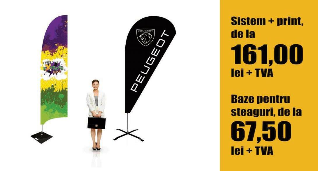 Prețul final pentru un steag complet echipat (sistem, print de calitate și bază de fixare la sol) pleacă de la 292 de lei.