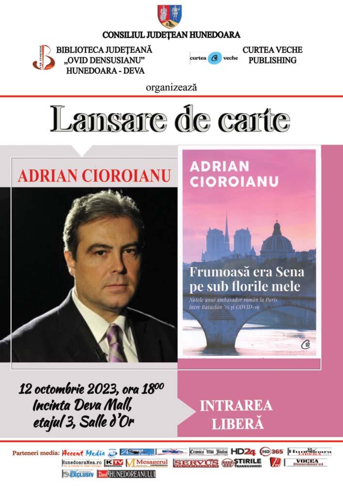 Biblioteca Județeană „Ovid Densusianu” HunedoaraDeva, în parteneriat cu Curtea Veche Publishing, organizează în ziua de 12 octombrie 2023, ora 1800, în incinta Deva Mall, etajul trei, Salle d’Or, în cadrul Salonului Hunedorean al Cărții, o întâlnire cu istoricul Adrian Cioroianu, care își va prezenta cu acest prilej cartea „Frumoasă era Sena pe sub florile mele”, apărută în acest an la Curtea Veche Publishing.