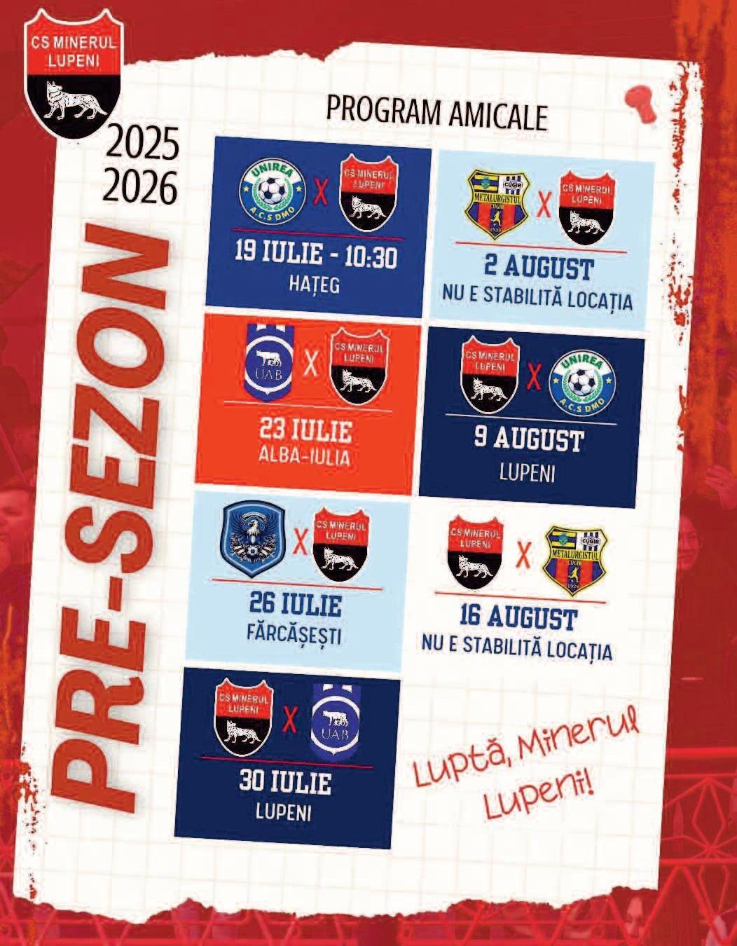CS Minerul Lupeni va disputa o serie de meciuri amicale în această vară pentru a-și calibra forma și a consolida echipa înainte de startul oficial al sezonului Iată programul complet: 19 iulie, ora 10:30, Unirea Hațeg (deplasare –Hațeg); 23 iulie, cu UAB Alba Iulia (deplasare – Alba Iulia); 26 iulie, cu Viitorul Fărcășești (deplasare – Fărcășești); 30 iulie, cu UAB Alba Iulia (acasă – Lupeni); 2 august, cu