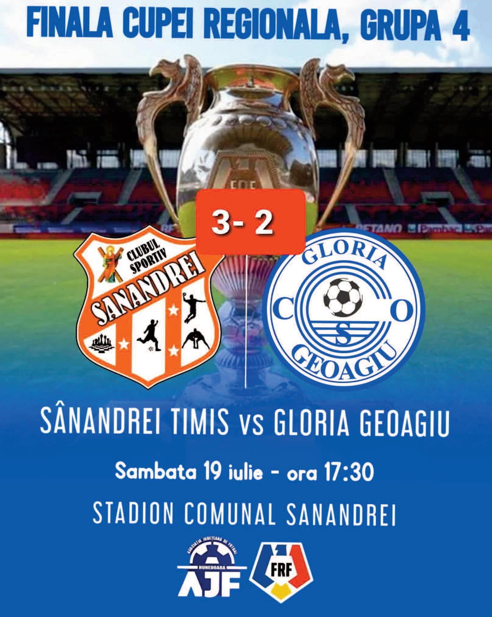 Un parcurs pe care Gloria l-a mai avut în anul 2023, dar pe care, din păcate, nu a reușit să îl reediteze acum A pierdut finala, trofeul pus în joc și șansa de a continua în competiția națională a Cupei României, în meciul disputat sâmbătă, 19 iulie 2025, pe terenul celor de la Sânandrei Carani, județul Timiș. Partida a început foarte bine pentru echipa din Geoagiu, care a deschis scorul prin Raul Noja. Gazdele și-au creat mari ocazii, dar Gloria Geoagiu a făcut 2-0 din penalty Claudiu Marcu a transformat fără emoții La pauză a fost 0-2 În repriza a doua, Gloria Geoagiu a căzut fizic, iar în minutul 66 gazdele au redus din diferență la 2-1 Cornel Apostol, portarul gazdelor, a făcut un meci senzațional, reușind să apere câteva goluri ca și făcute În minutul 86, Sânandrei reușește egalarea, chiar când cei de la Gloria se gândeau deja la victorie.