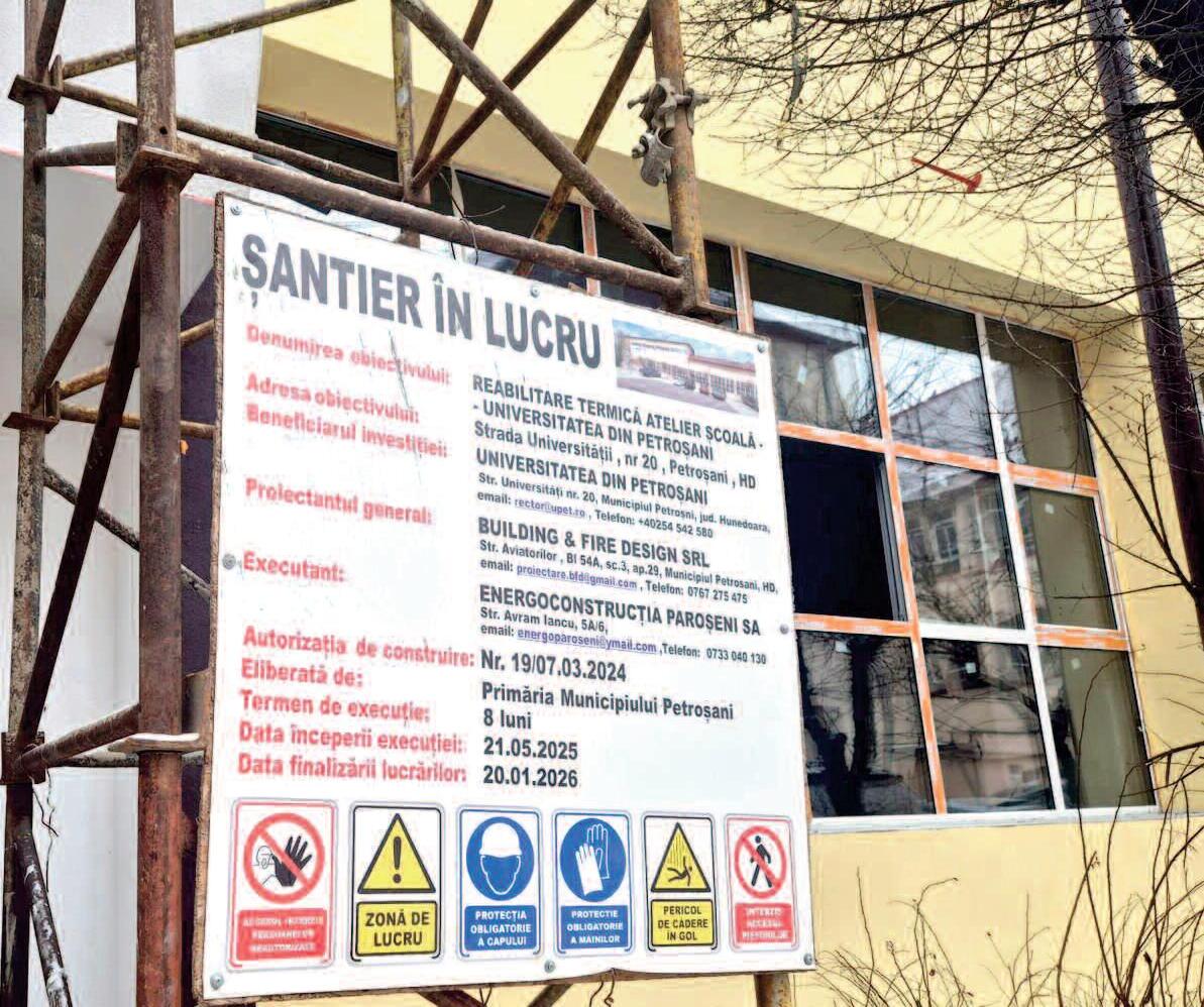 este realizată din fonduri europene, prin Programul Operațional Regional Vest, iar valoarea lucrării se ridică la aproximativ un milion de euro „Lucrarea se face pe fonduri europene Valoarea este de un milion de euro și avem termen să o finalizăm în acest an Cred că la finalul lunii august toată lucrarea va fi terminată”, a încheiat rectorul Sorin Radu La finalul lucrărilor, clădirea atelieruluișcoală va fi complet modernizată și eficientă energetic. Consumul de energie electrică va fi asigurat în mare parte de panouri solare montate pe acoperiș, ceea ce va reduce costurile de funcționare și impactul asupra mediului Universitatea din Petroșani spune că investiția va transforma acest spațiu într-un atelier modern, adaptat standardelor europene și nevoilor actuale ale studenților