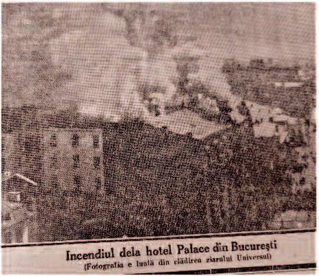 „Un violent incendiu a izbucnit ieri la ora 12 ziua la hotelul <<Palace>>, din bulevardul Elisabeta 18, proprietate domnului inginer N Pisiotta Focul a izbucnit din colțul stâng al podului și s-a întins cu o iuțeală vertiginoasă Flăcările, răzbind prin acoperiș, au fost văzute de trecători, cari au dat imediat alarma