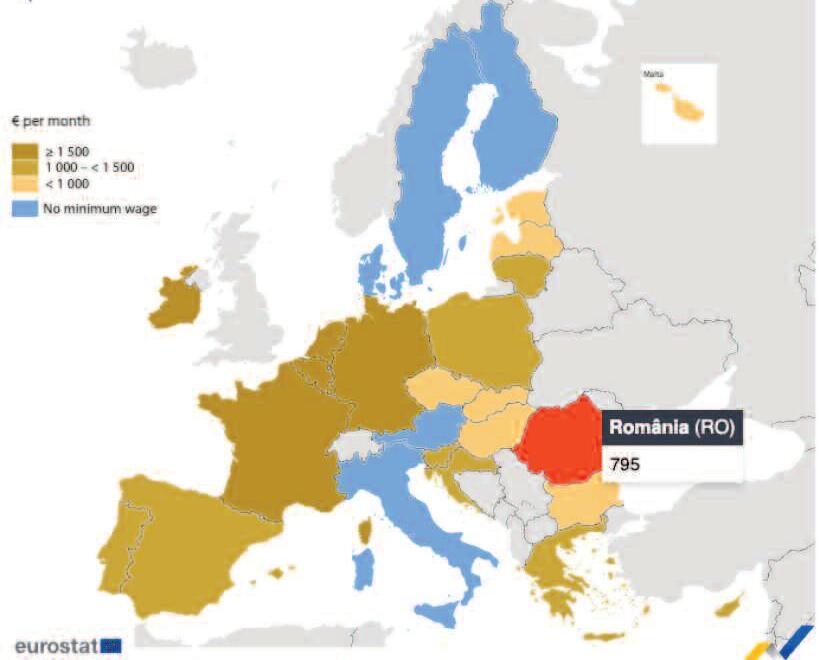 cum este cazul Greciei, Spaniei sau Portugaliei, astfel încât datele au fost ajustate pentru a reflecta echivalentul anual Diferențele mari dintre statele membre ale UE ridică întrebări despre competitivitatea pieței muncii, puterea de cumpărare și standardul de viață al angajaților din fiecare țară. România se află încă în partea inferioară a clasamentului, în ciuda eforturilor recente de majorare a salariului minim În timp ce Luxemburg, Irlanda sau Germania oferă salarii minime care depășesc 2 300 de euro, România și alte câteva state esteuropene continuă să se situeze sub pragul de 800 de euro. Subiectul rămâne sensibil pentru guvern și