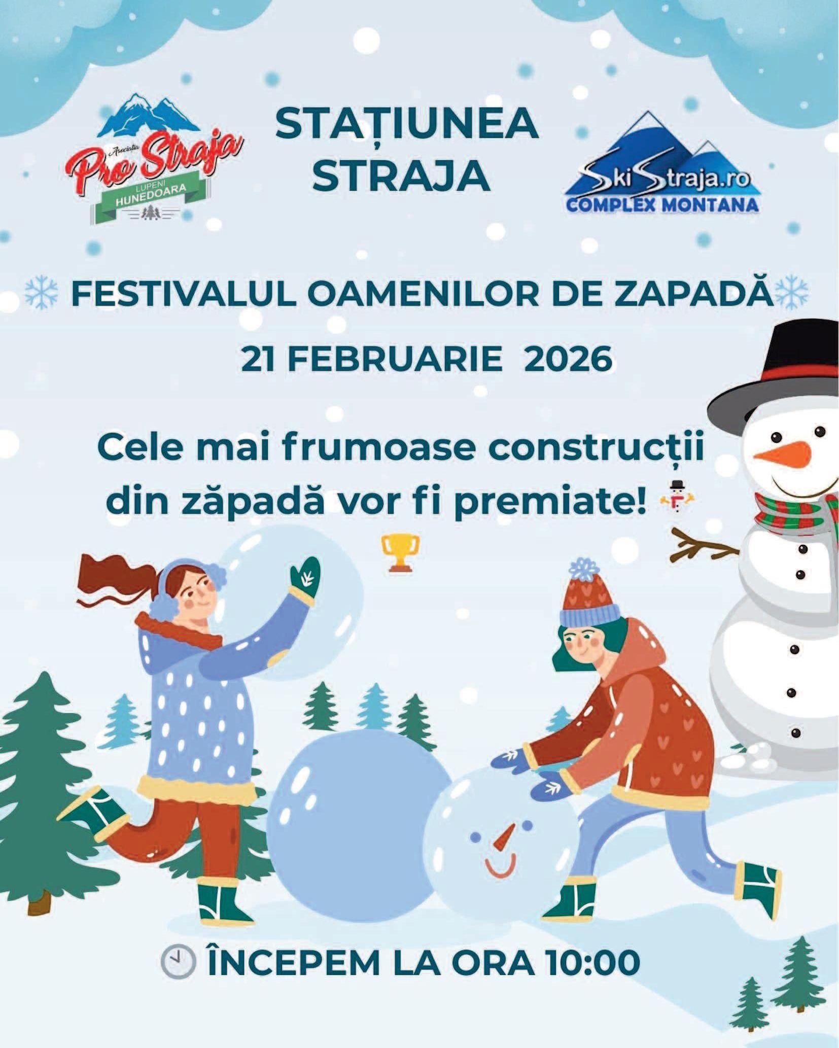Chiar dacă săptămâna de vacanță este pe final, în Straja distracția este în linie dreaptă. Straja se pregătește să găzduiască un maraton al evenimentelor de tradiție, profitând de zăpada din plin și de fluxul de elevi care vor sosi în județ până la finalul lunii. De la creativitate la viteză pură, Straja oferă câte ceva pentru fiecare: de la deja celebrul Festival al Oamenilor de Zăpadă, până la adrenalina de pe traseul „Pe Canal”. Pregătirile sunt pe ultima sută de metri, iar agenda este plină până în luna martie.