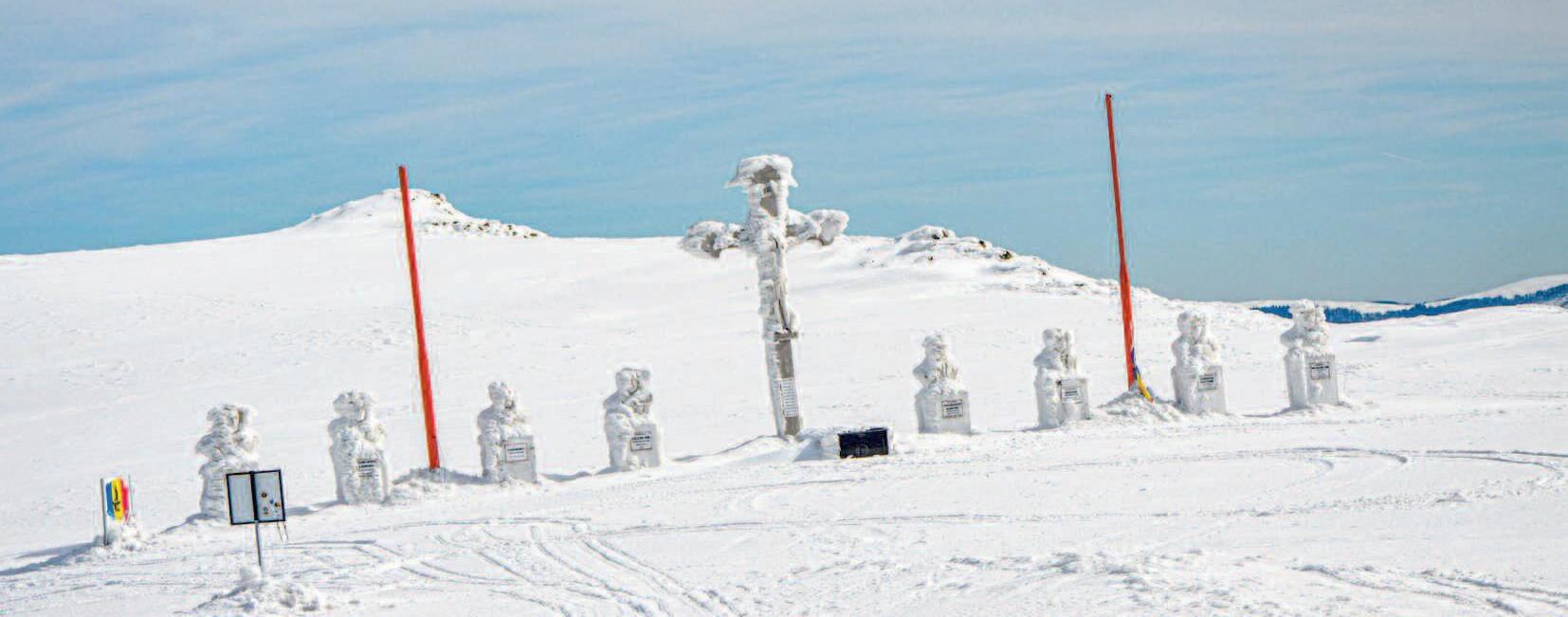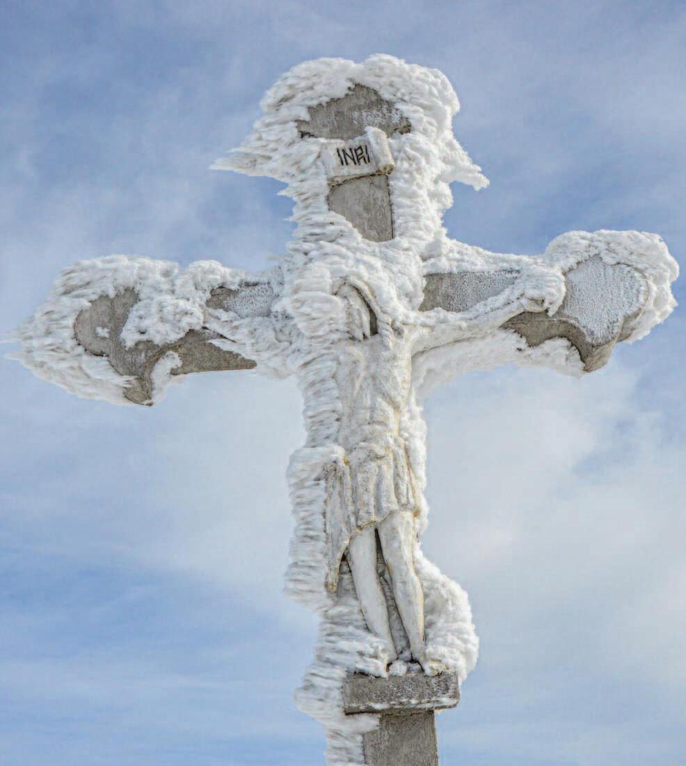 Monumentele, acoperite de zăpada înghețată și modelată de vântul aspru de munte transformă locul într-un tablou impresionant Imaginile au fost surprinse de Nicu Ardeu, un hunedorean pasionat de drumeții și fotografie, care a urcat în Pasul Vâlcan pentru a imortaliza frumusețea zonei. Panteonul din Pasul Vâlcan este un grup statuar format din opt busturi, așezate de o parte și de cealaltă a unei cruci pe care stă răstignit Iisus Hristos Busturile îi înfățișează pe Regele Ferdinand al României, Regina Maria a României, locotenent-erou Emil I. Popovici (comandant al Companiei a 11a – Batalionul III, Regiment 18 Infanterie