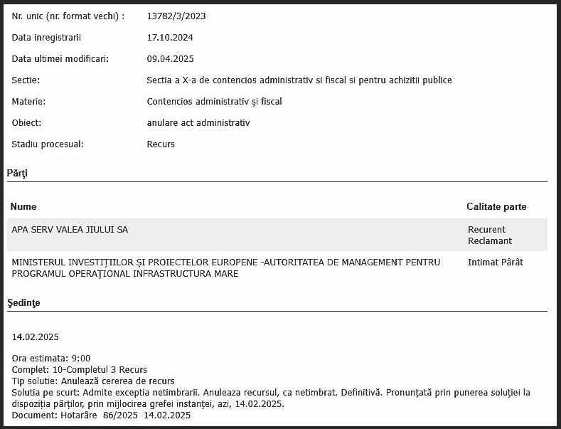În consecinţă, Curtea de Apel Bucureşti a anulat recursul declarat de ASVJ SA ca netimbrat, soluția instanței (Hotărârea nr. 86/14.02.2025) fiind definitivă. Cu alte cuv inte, pentru că, din 19.03.2024 (când procesul era la Tribunalul București) până la 14 02 2025 (termenul final al recursului, la Curtea de Apel București), ASVJ SA nu a reușit (a se citi “nu a vrut”) să achite taxa de timbru în valoare de 20 de lei, procesul a fost pierdut definitiv şi, împreună cu el, şansa de anulare a Deciziei nr. 2607R/07.03.2023 şi a Raportului de neconformitate nr 21143/13 02 2023, precum şi de recuperare la bugetul ASVJ SA a sumelor achitate către MIPE Să nu catalogaţi drept banale greşeli în sarcina angajaţilor şi a managementului ASVJ SA aspectele relatate mai sus. Nicidecum. În primul rând, pentru că au fost în mod repetat sancţionaţi pentru încălcarea legii (în arhiva publicaţiei noastre puteţi regăsi articole pe aceeaşi temă), angajaţii şi managementul ASVJ SA nu îşi permit să se încoarde la cei de la Constatare Nereguli şi Antifraudă În al doilea rând, niciun conflict deschis cu cei de la Camera de Conturi Hunedoara nu-i coafează pe cei de la operatorul regional de apă şi canalizare Drept urmare, tactica cu iz infracţional e simplă ASVJ SA primeşte sancţiuni, le achită, iar apoi se face că se preocupă de recuperarea prejudiciilor Doar se face