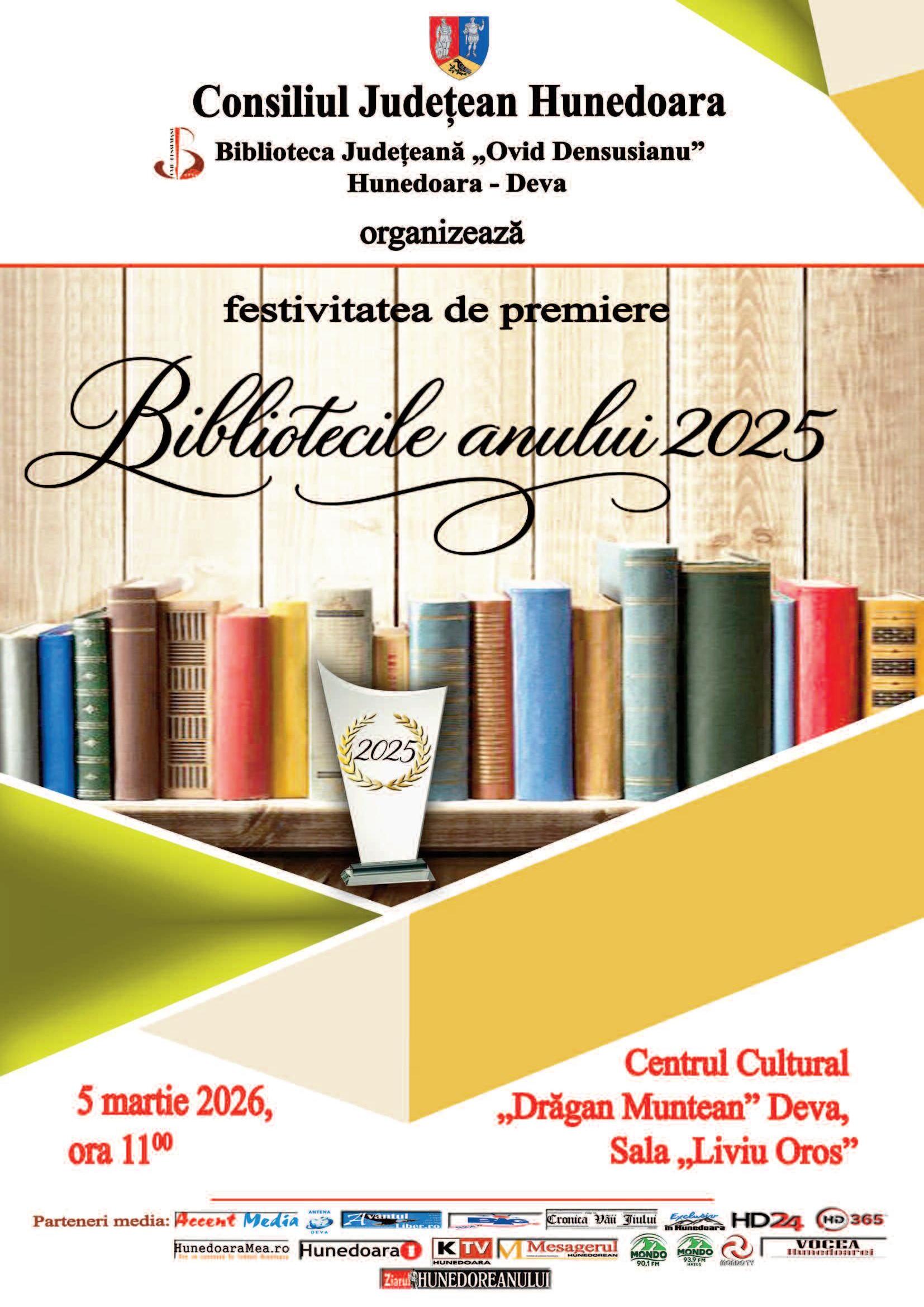 Județeană „Ovid Densusianu”, cu sprijinul Consiliului Județean Hunedoara, organizează joi, 5 martie, festivitatea de premiere a celor mai bune biblioteci publice din județ pentru rezultatele obținute în anul 2025