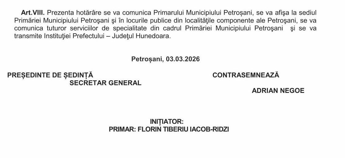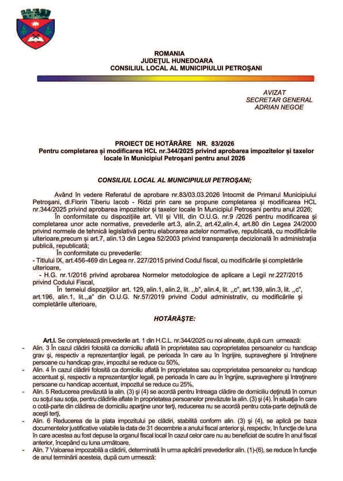 administrația locală din Petroșani a aprobat o serie de reduceri pentru impozitele pe clădiri și autoturisme, aplicând noile prevederi ale Ordonanței de Guvern nr. 9/ 2026. Măsurile vizează în special sprijinirea persoanelor cu