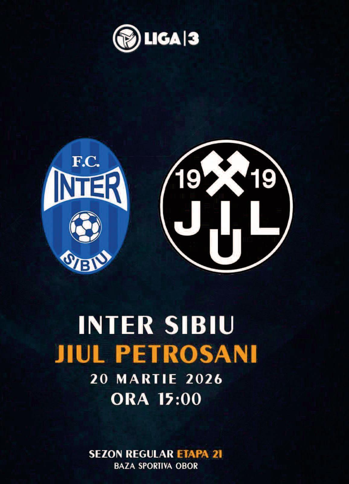 Lupta pentru puncte se mută vineri, 20 martie, pe Baza Sportivă „Obor” Jiuliștii vor da piept cu Inter Sibiu, într-un meci în care determinarea și spiritul de echipă vor fi armele principale sub culorile clubului. Mesajul vestiarului este clar: „Luptăm până la capăt!”. După o perioadă de pregătire intensă, băieții sunt gata să demonstreze că sunt mai puternici împreună și că tradiția Jiului obligă la performanță, indiferent de dificultatea deplasării Suporterii sunt așteptați să fie alături de echipă, fie din tribune, fie prin energia transmisă de la distanță