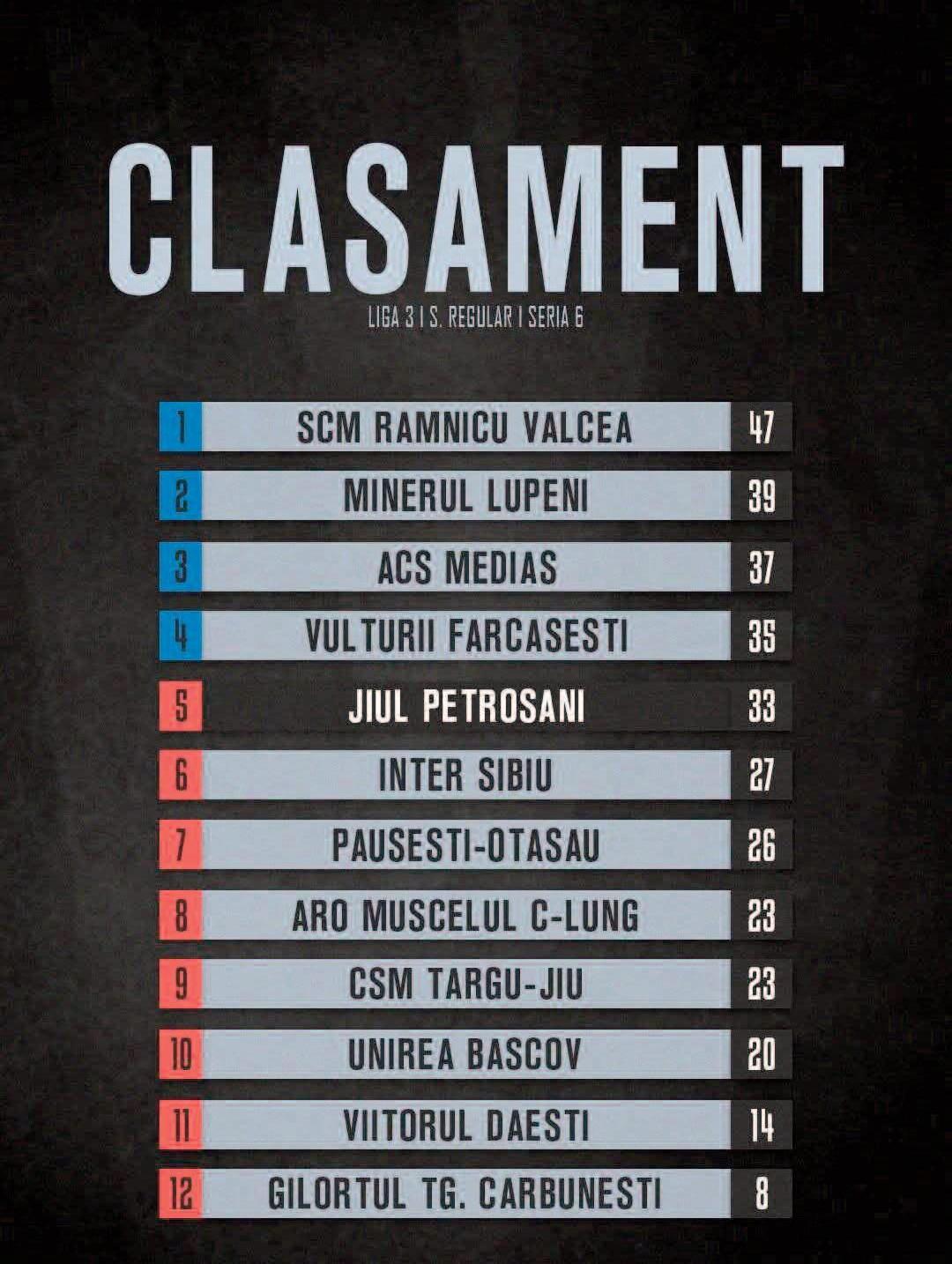 Cu două victorii consecutive în cont, echipa din Vale revine „în grafic”, transformând finalul sezonului regulat într-un adevărat thriller matematic. În timp ce Vâlcea și Lupeni și-au asigurat deja liniștea calificării, bătălia pentru ultimele două bilete de play-off (locurile 3 și 4) a devenit o afacere în trei: Mediaș (37 puncte), Fărcășești (35 puncte) și Jiul (33 puncte).