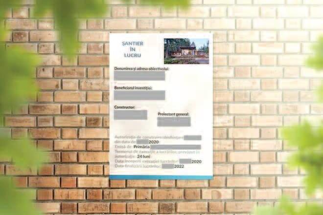 Montează panoul într-un loc vizibil din spațiul public De regulă, îl pui la intrarea în șantier sau pe gardul principal Tu trebuie să asiguri vizibilitate bună, pentru ca datele să poată fi citite ușor