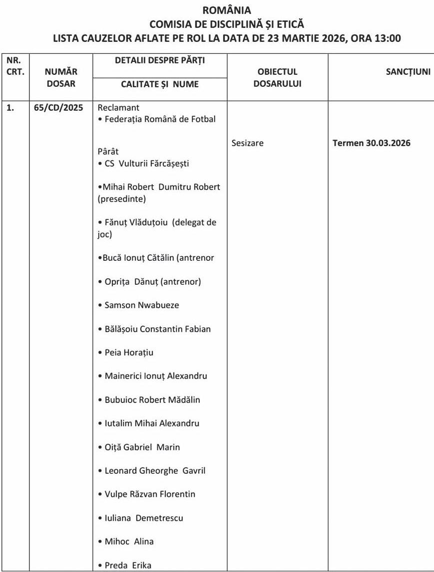 În dosarul cu numărul 65/ CD/2025, clubul CS Vulturii Fărcășești se află în atenția Comisiei într-o cauză complexă Lista pârâților este una extinsă, incluzând președintele clubului, delegați de joc, antrenori și numeroși jucători Comisia a stabilit un nou termen pentru data de 30 martie Din partea clubului Jiul se află numele președintei de la CSM, Erika Preda.