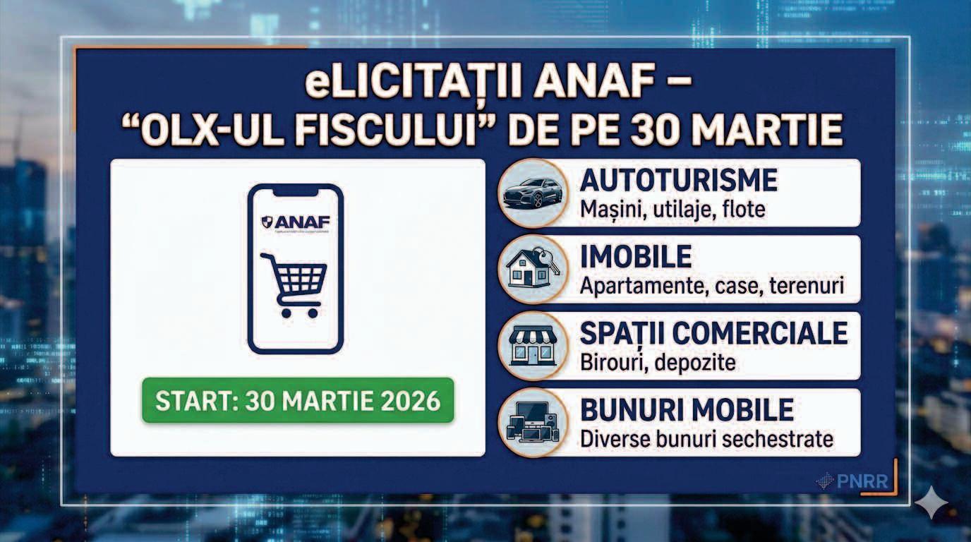 Vânătorii de chilipiruri se mută în online. De pe 30 martie, Fiscul lansează propriul „OLX”, platforma eLicitațiiANAF, unde casele, mașinile și bunurile confiscate de la datornici vor fi vândute la un click distanță. Sistemul promite transparență totală și prețuri de ocazie, eliminând cozile de la ghișee.