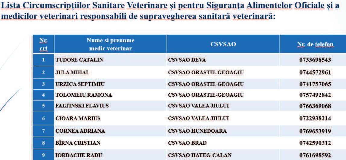 nereguli la numerele de telefon puse la dispoziție de autorități „Consumatorii pot sesiza abateri de la normele sanitare veterinare în vigoare, înregistrate pe teritoriul județului Hunedoara, la telefon 0254221145 sau se pot adresa Circumscripțiilor Sanitare Veterinare și pentru Siguranța Alimentelor Oficiale (Zonale), unde va fi afișat programul de lucru, persoana responsabilă și numărul de telefon la care consumatorii pot sesiza orice aspect de nelegalitate”, a mai punctat dr. Lucian Josan, director executiv DSVSA Hunedoara