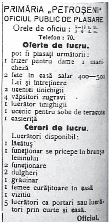 Deși concis, anunțul este lămuritor: „În dorința de a contribui într-o măsură cât mai largă la satisfacerea nevoilor de brațe ale industriei noastre, cât și a celorlalte categorii de activitate, prin procurarea de muncitori și salariați cu bună pregătire în meșteșug, Primăria a creat Oficiul pentru găsire de lucru și de lucrători Oficiul este organizat după sistemul celor din străinătate în coînțelegere cu Inspectoratul Muncii din Arad, având în vedere plasarea în cât mai bune condiții, în timpul cel mai scurt atât pentru cei care oferă, cât și pentru cei care cer de lucru. Pentru orice nevoie de salariați: lucrători, ucenici sau muncitori de orice categorie, funcționari, precum și personal de serviciu, vă rugăm să binevoiți a vă adresa acestui oficiu, fie în scris prin poștă, fie personal, în orice zi de lucru, fie prin telefon”