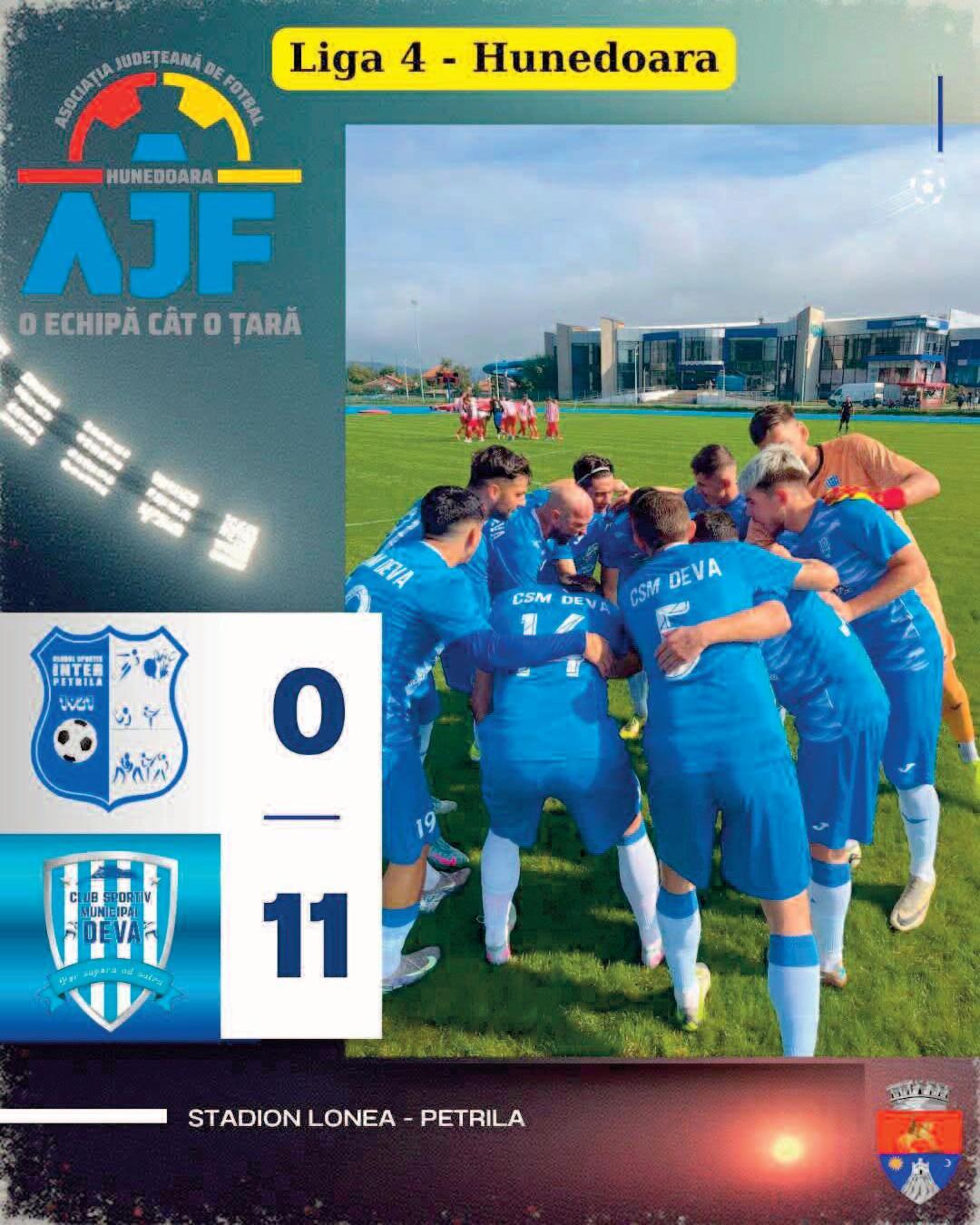 Fotbaliștii de la CSM Deva au oferit o adevărată lecție de fotbal pe terenul celor de la CS Inter Petrila, reușind o victorie categorică, scor 0-11! Încă de la primul fluier, elevii antrenați de stafful tehnic al Devei au impus un ritm sufocant, controlând ostilitățile în mod autoritar Diferența de valoare s-a reflectat pe tabela de marcaj încă din prima repriză, iar echipa nu a slăbit deloc presiunea până la finalul celor 90 de minute
