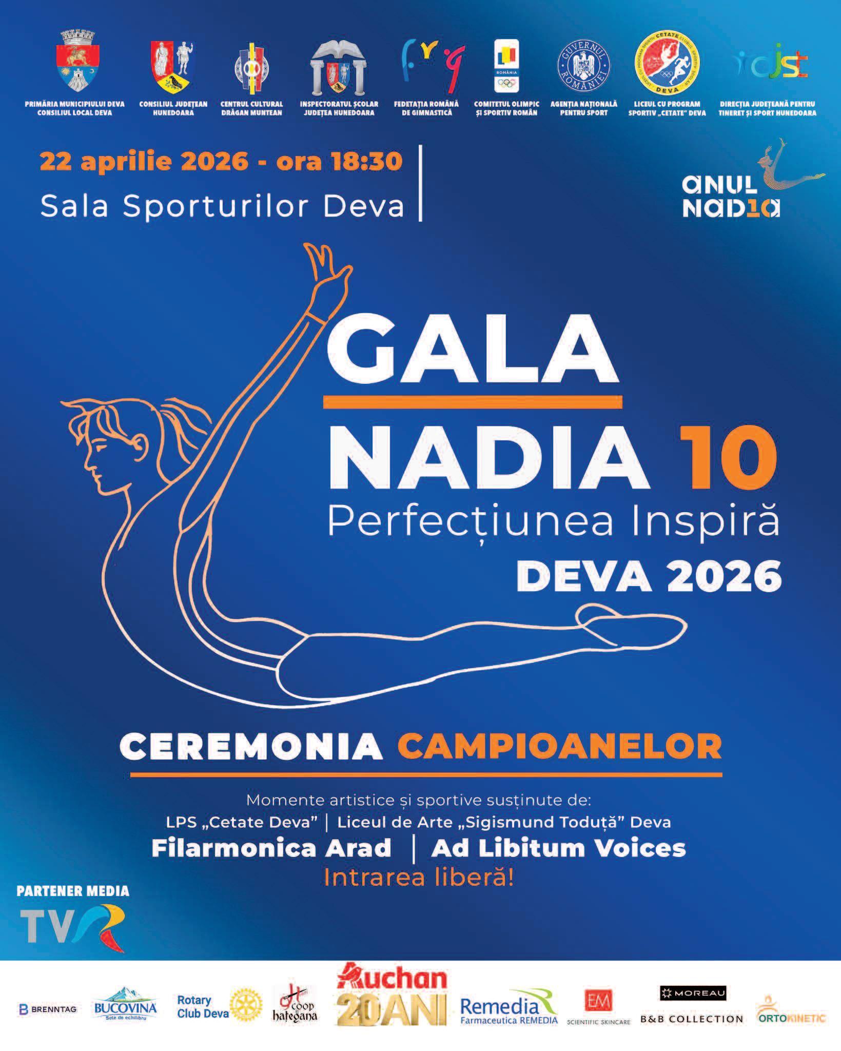 Muntean”, Inspectoratul Școlar Județean Hunedoara, Comitetul Olimpic și Sportiv Român și Agenția Națională pentru Sport, este un omagiu adus gimnasticii de performanță și tuturor celor care, prin inspirația oferită de marea performanță a Nadiei Comăneci, au dus mai departe genialitatea gimnasticii românești”, informează reprezentanții primăriei Deva Gala va avea loc la Sala Sporturilor din Deva, începând cu ora 18:30, iar accesul publicului este gratuit