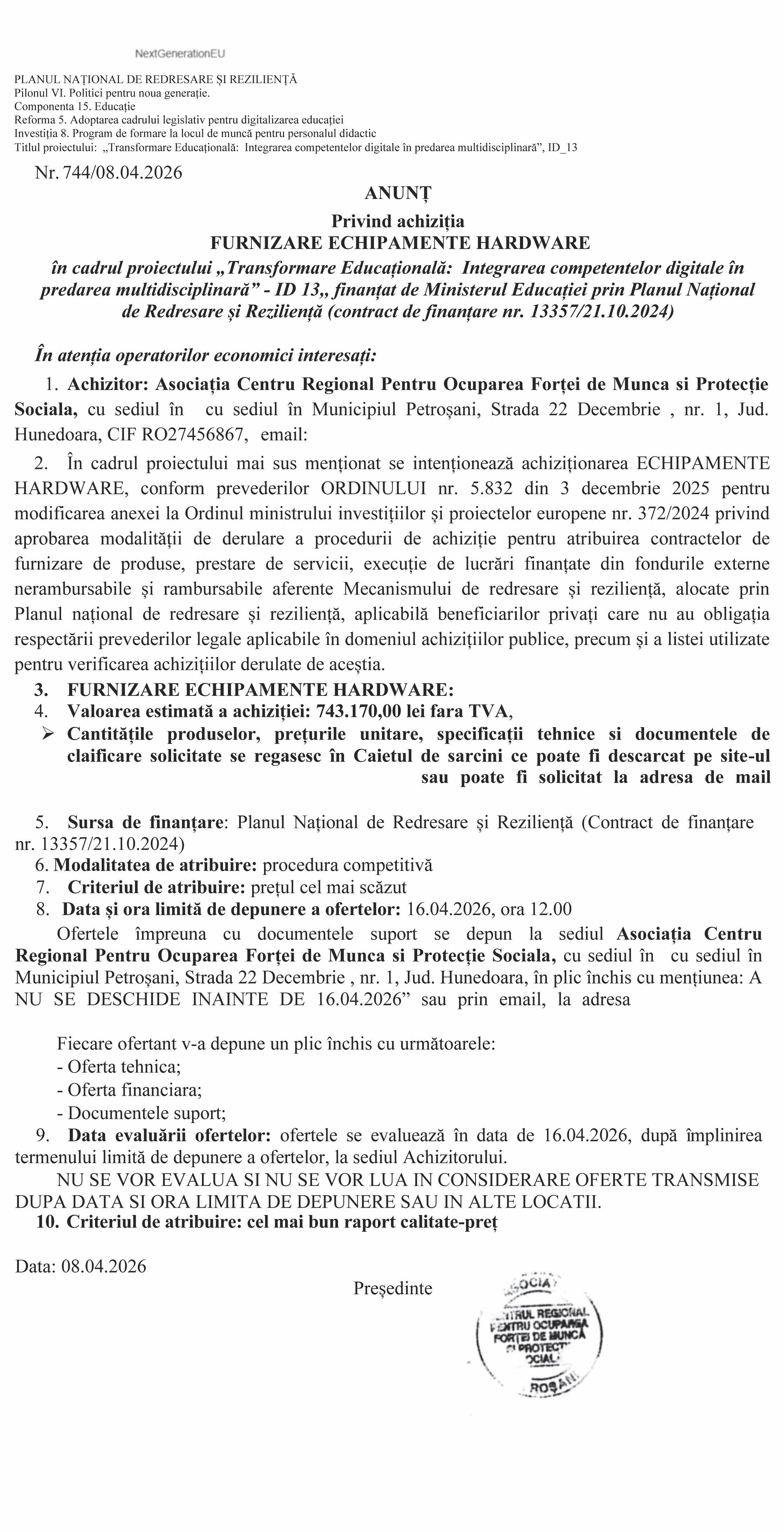 Adunarea Generală Ordinară a Acționarilor, în data de 11.05.2026, ora 11:00, la sediul societății din Petroșani, str.1 Decembrie 1918, bl.97, parter, cod poștal:332019, jud.Hunedoara, cu data de referință pentru acționari 01.05.2026.
