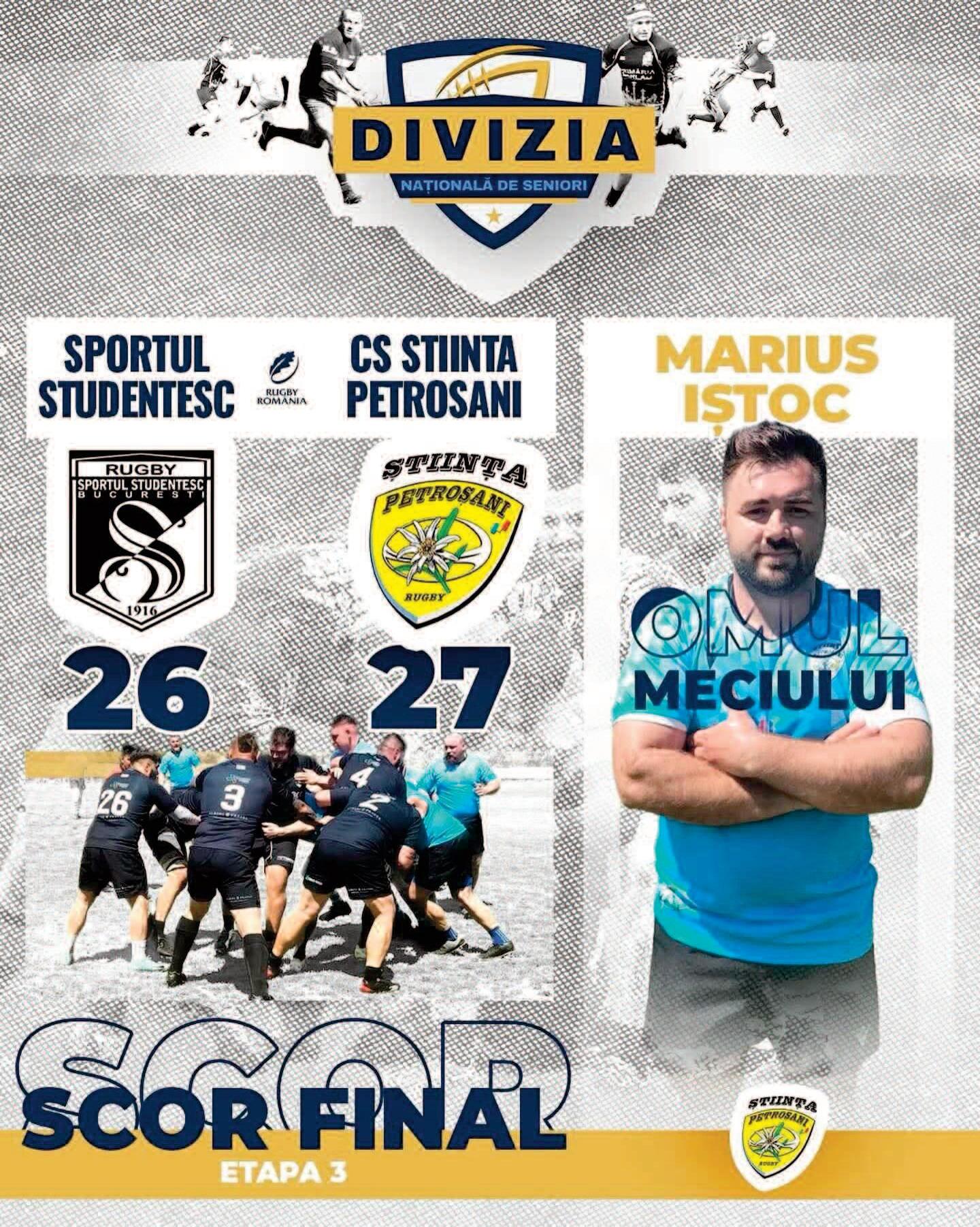 Meciul a fost unul de o intensitate maximă, ambele echipe luptând până în ultima secundă pentru fiecare centimetru de teren Deși „studenții” au pus o presiune constantă pe tabelă, defensiva și spiritul de luptă al celor de la Petroșani au făcut diferența în acest duel extrem de echilibrat Scor final: Sportul Studențesc - CS Știința Petroșani 26-27