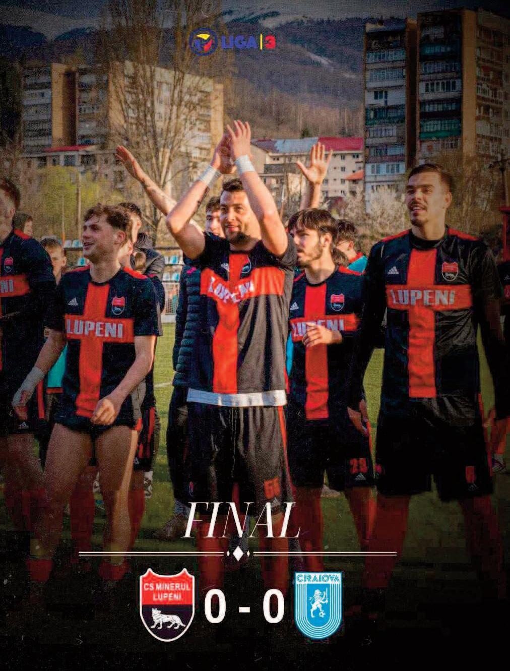 Chiar dacă rămân doar cu un punct după această etapă, Minerul se poate declara mulțumit de nivelul de joc arătat Atitudinea din teren și determinarea de a lupta până în ultima secundă sunt semnalele pozitive care dau încredere echipei pentru restul sezonului de Liga 3 Minerul Lupeni merge mai departe cu fruntea sus, demonstrând că este o echipă greu de bătut, capabilă să impună ritmul în fața unor adversari de calibru. Scor final: Minerul Lupeni 0 - 0 Universitatea Craiova II.