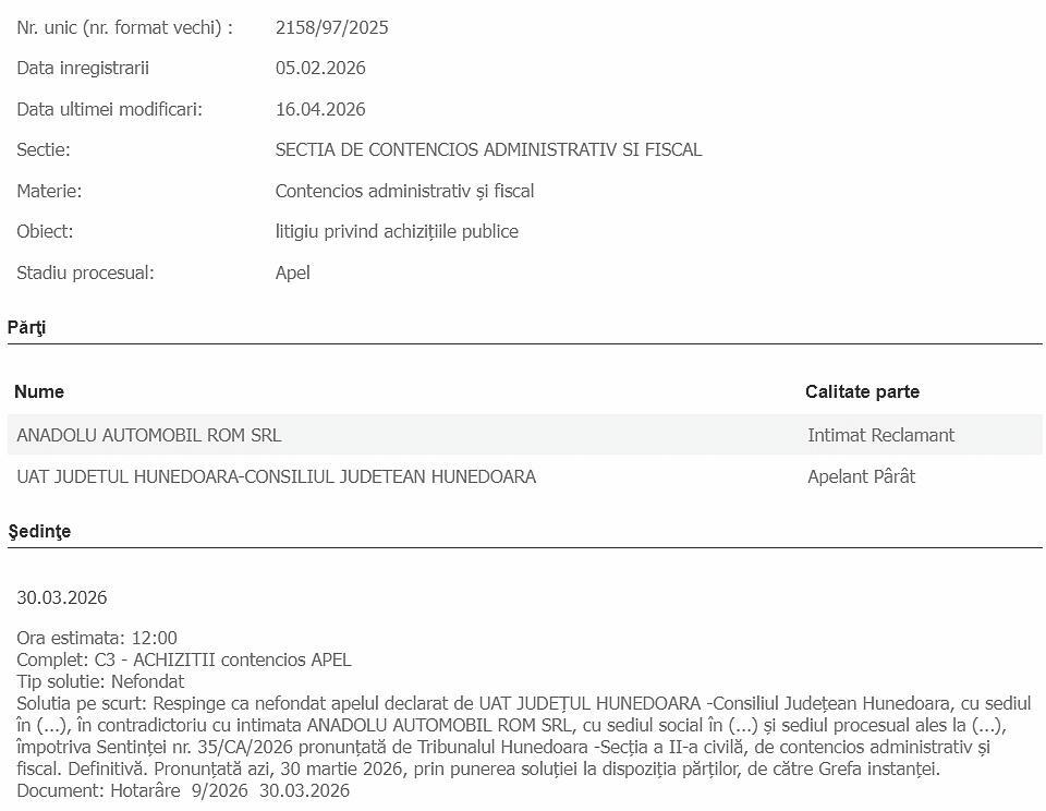 În esență,… …președintele Nistor chiar are dreptate. Juriștii administrației județene au nevoie de ajutor extern în dosare aflate pe rolul instanțelor de judecată. Iată ce nu ne spune președintele Nistor: O soluție judecătorească pronunțată în 20 ianuarie 2026 (35/2026 – Tribunalul Hunedoara), rămasă definitivă prin Hotărârea nr 9/30 03 2026 a Curții de Apel Alba Iulia, pune Consiliul Județean Hunedoara în situația de a plăti sume suplimentare considerabile către SC Anadolu Automobil Rom SRL, furnizorul autobuzelor electrice achiziționate în cadrul proiectului Green Line Valea Jiului.