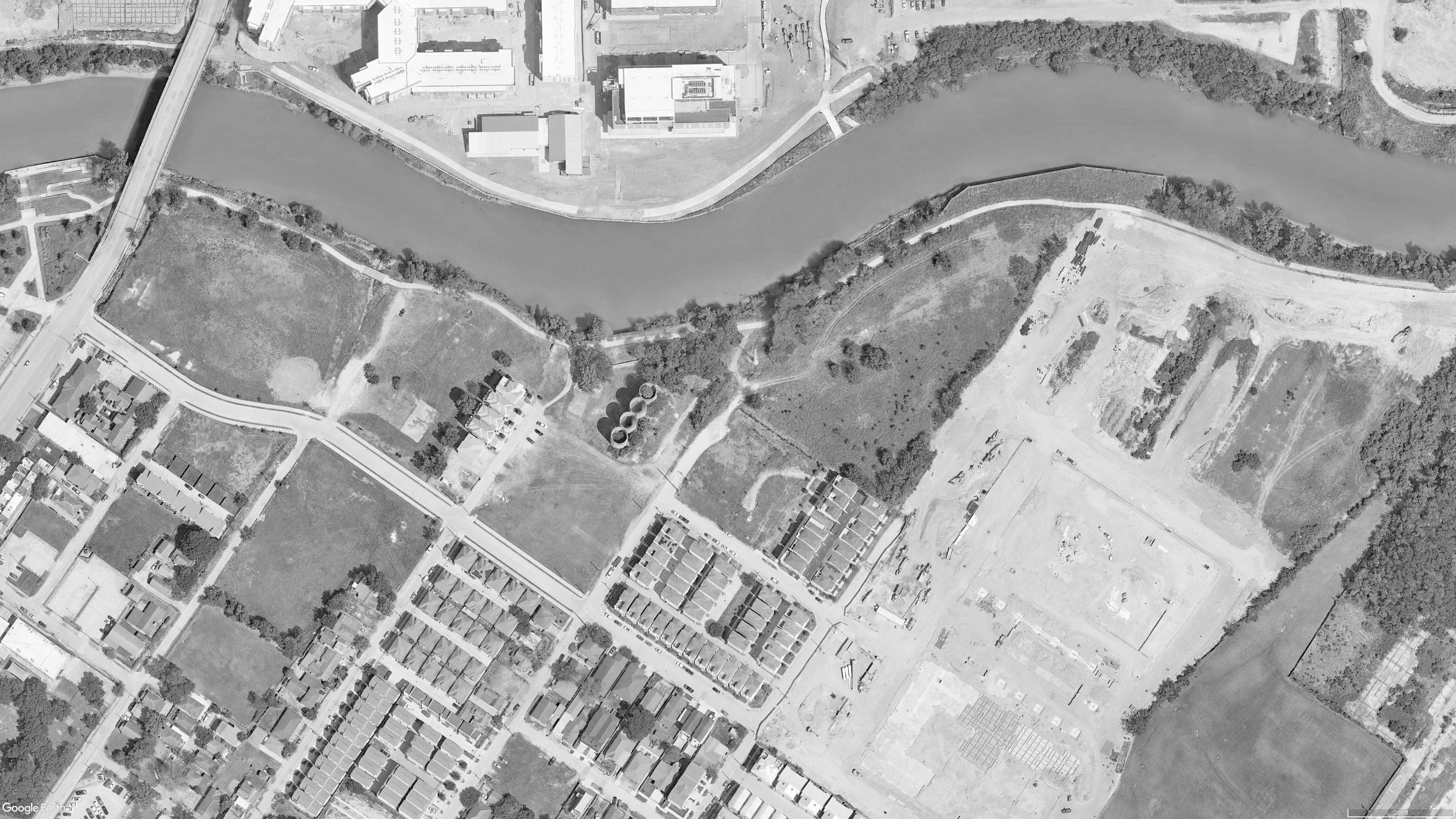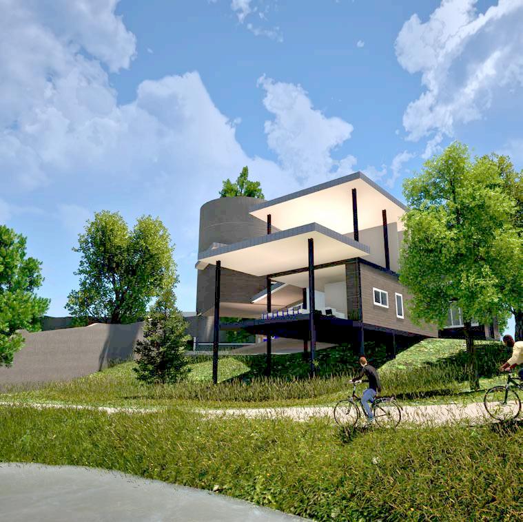 Offline OASIS is a two-story residence designed for Wade “Parzival” Watts, the main character of Ernest Cline’s Ready Player One. The home sits along the Buffalo Bayou waterway, adjacent to four historic gravel silos, two of which that have large trees growing within.