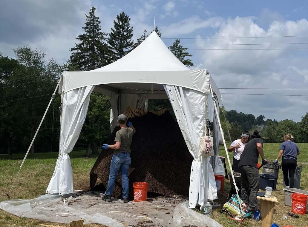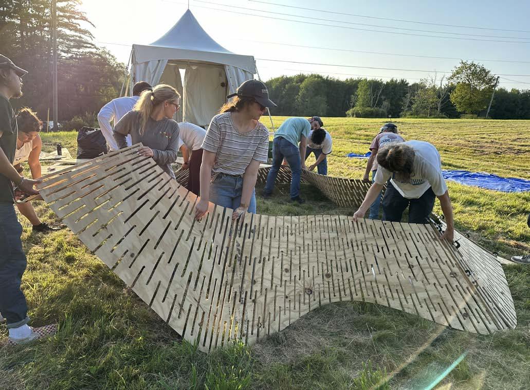 This project was fabricated in Bethel, New York as a portion of a product design course where students spent two weeks doing on-site fabrication towards a pair of parametrically designed pavilions that are composed of computationally designed ruled surfaces made from hand-cut plywood and clad in bio-composite materials with locally sourced ingredients.
